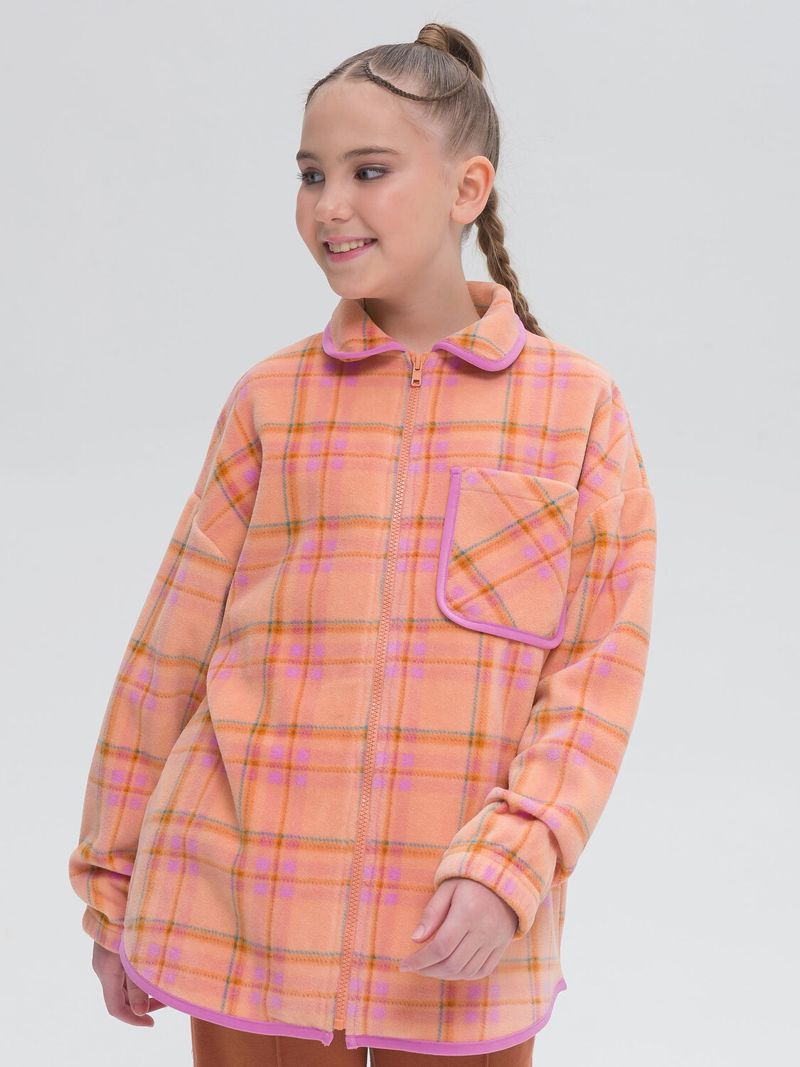 Рубашка оверсайз из принтованного в клетку флиса для девочки. Достоинства ткани – сухо и тепло даже в дождливую погоду, комфортно носить и легко ухаживать. Отложной воротник – легко менять образ и защищаться от ветра. Спущенный рукав и увеличенная пройма для удобства использования в качестве верхнего слоя в одежде – отлично комбинируется с толстовкой, худи, жилетом. Накладной карман сбоку, воротник и низ модели обработаны контрастной эластичной тесьмой. Изделие с достоинствами рубашки, ветровки, жакета – многофункционально и незаменимо весной и летом в прохладную погоду.