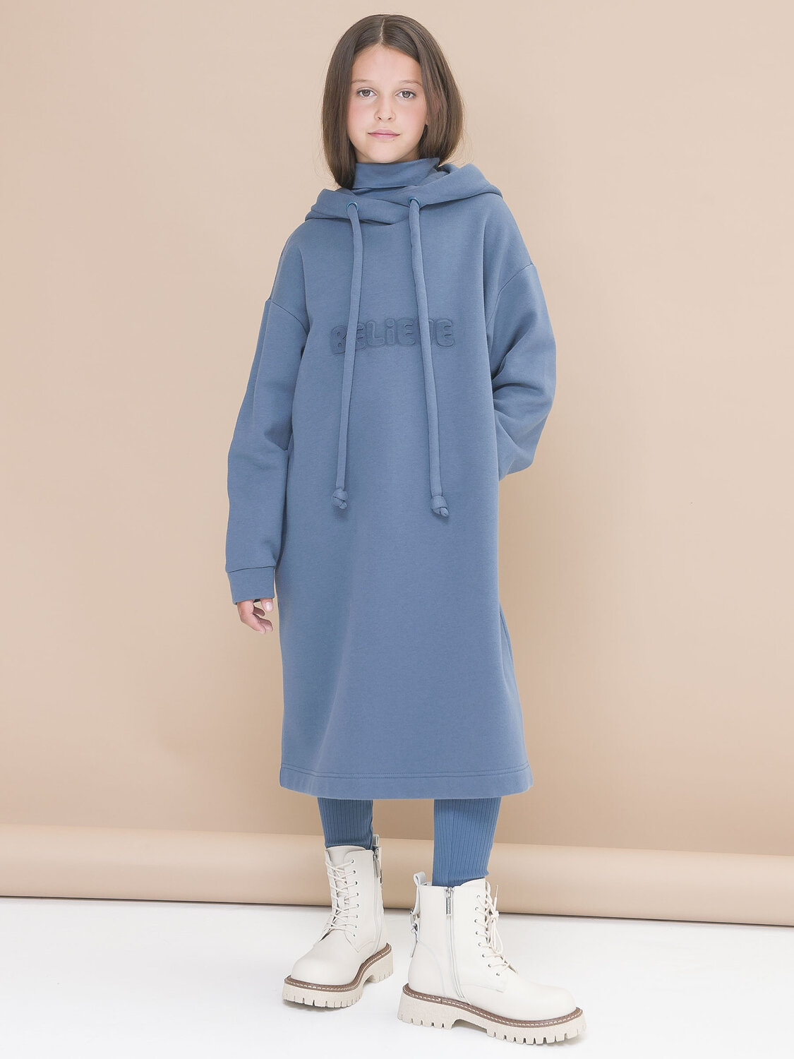Платье с капюшоном для девочки оверсайз. Платье толстовка на девочку с длинным рукавом, свободного прямого кроя, удлиненное ниже колена, с разрезиками внизу, капюшон на толстой завязке. Спереди необычны выпуклый принт надпись. Базовый вариант детского гардероба из футера для осени и зимы. Для современных девочек комфортная и универсальная свободная детская одежда вышла на первый план. Просторное теплое детское спортивное платье для подростка не сковывает движений, в нем удобно бегать, прыгать при этом выглядеть по-девичьи. Утепленное платье создано для активной жизни ребенка. Зимнее платье идеальный вариант для детей для повседневной носки на каждый день, подойдет на прохладную погоду, в нем можно много гулять, а от ветра защитит капюшон.