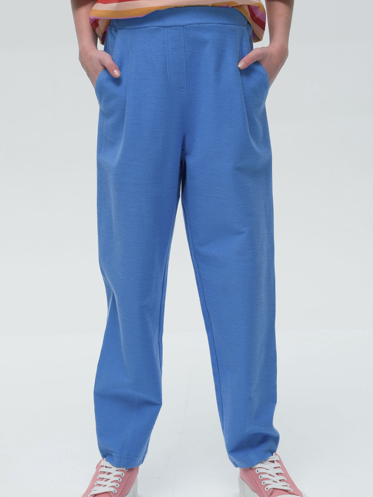 Слоучи из футера для девочки. 100% хлопок в составе – ткань мягкая, дышащая, приятная на ощупь. Сшиты изнанкой футера наружу и выделяются оригинальной петельной фактурой – полное соответствие тренду сезона. Широкая резинка по линии талии сбоку и на спинке, имитация гульфика – как у джинсов, но только с мягким комфортом футера. Большой объем в бедрах и сужение книзу за счет декоративных вытачек – для свободы движений и поддержания формы. Удобно надевать, приятно носить, легко быть активным каждый день. Слоучи комбинируются с футболкой или лонгсливом.Состав: 100%хлопокВозрастная группа: Дети | (7-11)Сезон: ВеснаГод: 2023Пол: Девочки