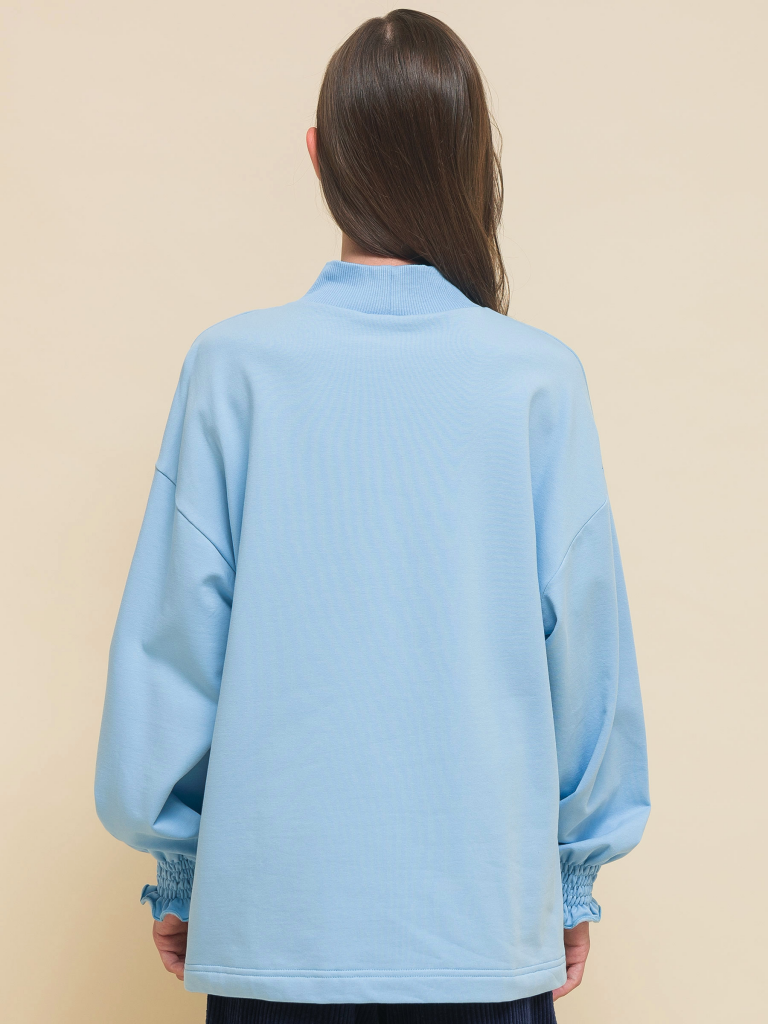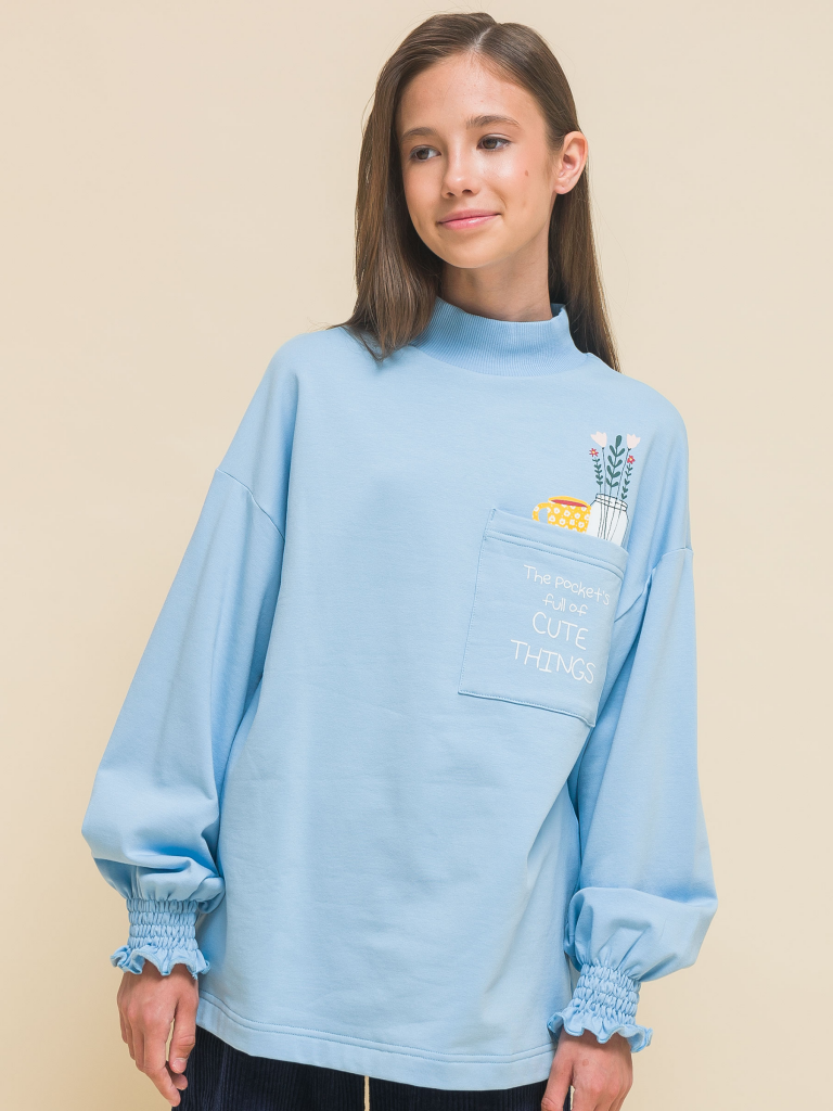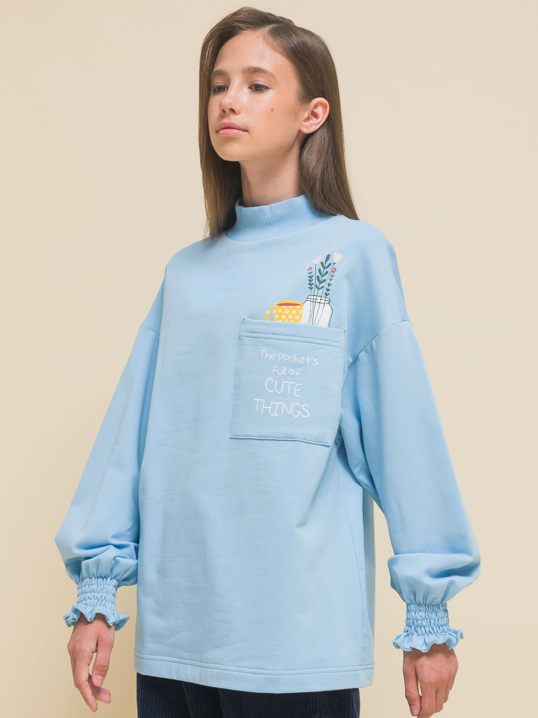 Детский свитшот для девочки из футера с начесом. Джемпер актуального свободного кроя со спущенным плечом подарит ребёнку комфорт и не будет стеснять его движений. Оверсайз-свитшот дополнен воротником-стойкой, который обеспечивает дополнительную защиту шеи от холода и ветра. Воротник выполнен из эластичной рибаны (ткань в рубчик) — он хорошо тянется, ребёнку удобно надевать и снимать свитшот, при этом воротник прекрасно сохраняет форму. Низ рукавов собран на тонкую резинку в несколько рядов, что придаёт модели элегантности и женственности. Слева на груди накладной карман для мелочей. За толстовкой легко ухаживать. В составе ткани преобладает высококачественный хлопок — свитшот приятен на ощупь и безупречно пропускает воздух, давая коже ребёнка дышать. Благодаря эластану изделие сохраняет отличную форму в течение долгого времени. Свитшот с принтом по переду (принт на кармане + «выглядывает» из кармана). Милый принт с уютным настроением изображает чашку с какао и вазу с цветами, надпись переводится: «карман, полный милых штук». Принты мягкие и эластичные — великолепно переносят частые стирки. Джемпер выполнен в красивом голубом цвете, его легко сочетать с любыми брюками, легинсами, джинсами. В линейке представлены следующие размеры: 2 (92): 3 (98): 4 (104): 5 (110): 6 (116): 7 (122): 8 (128): 9 (134): 10 (140): 11 (146). Свитшот с начёсом подходит девочкам дошкольного возраста, младшим школьницам и девочкам-подросткам. Он идеален для детского сада, прогулок, активного отдыха, его можно носить дома. Свитшот детский подходит для круглогодичного применения: летом, осенью, зимой, весной и демисезон. Это замечательный подарок дочери, внучке или сестре на День рождения и любой другой праздник. Состав: 95%хлопок 5%эластан Возрастная группа: Сезон: Осень Год: 2023 Пол: Девочки