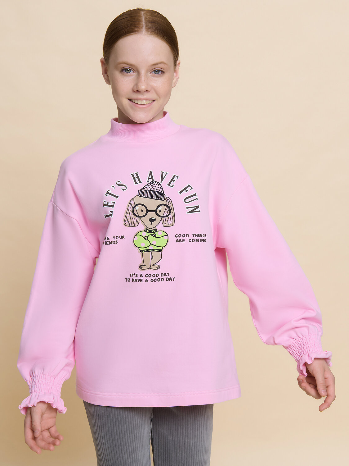Детский свитшот для девочки из футера с начесом. Толстовка трендового свободного кроя со спущенным плечом подарит ребёнку комфорт и свободу движений. Оверсайз-свитшот дополнен воротником-стойкой, который обеспечивает дополнительную защиту шеи от холода и ветра. Воротник выполнен из эластичной рибаны (ткань в рубчик) — он прекрасно тянется, ребёнку удобно надевать и снимать свитшот, при этом воротник отлично сохраняет форму. Низ рукавов собран на тонкую резинку в несколько рядов, что придаёт изделию элегантности и женственности. Джемпер неприхотлив в уходе. В составе ткани преобладает высококачественный хлопок — свитшот мягкий и великолепно пропускает воздух — кожа ребёнка дышит. Благодаря эластану изделие сохраняет первоначальную форму в течение долгого времени. Принты эластичные и прочные — без проблем переносят многочисленные стирки. Джемпер выполнен в нежном бежевом цвете, его просто комбинировать с любыми брюками, легинсами, джинсами. Размерная линейка: 2 (92): 3 (98): 4 (104): 5 (110): 6 (116): 7 (122): 8 (128): 9 (134): 10 (140): 11 (146). Свитшот с начёсом подходит девочкам дошкольного возраста, младшим школьницам и девочкам-подросткам. Его можно носить в детский сад, на прогулки, во время отдыха, а также дома. Свитшот детский идеален для круглогодичного применения: летом, осенью, зимой, весной и демисезон. Это стильный и практичный подарок дочери, внучке или сестре на Новый год и любой другой праздник.
