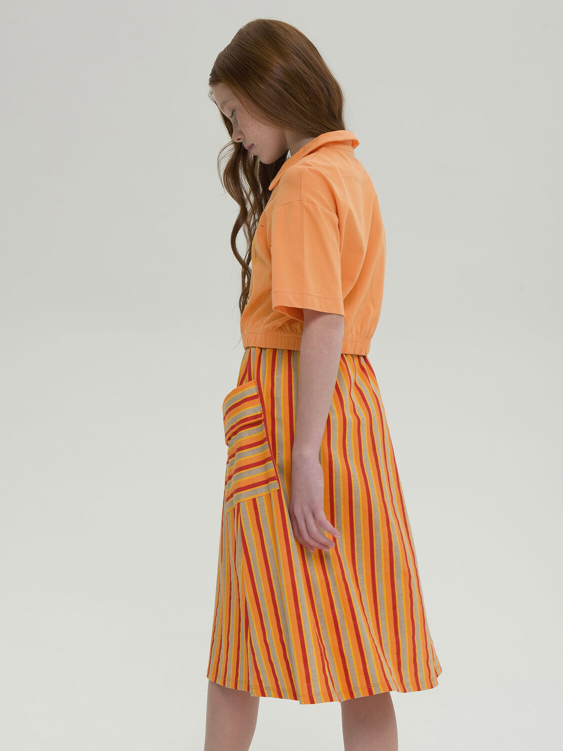 Модная трикотажная юбка для девочки на резинке - это практичный вариант на каждый день. Выполнена из воздушного хлопкового трикотажа принтованного в полоску - идеальна для жаркой погоды. Юбка, слегка расклешенная книзу, длиной до середины икры. По бокам два больших накладных наклонных кармана с клапанами привлекают внимание и делают юбку самой актуальной в этом сезоне. Широкая резинка не давит, не натирает - удобно и комфортно в течение всего дня. Легкая повседневная юбка займет достойное место в гардеробе девочки, подойдет как для ежедневной носки, так и для особых случаев.