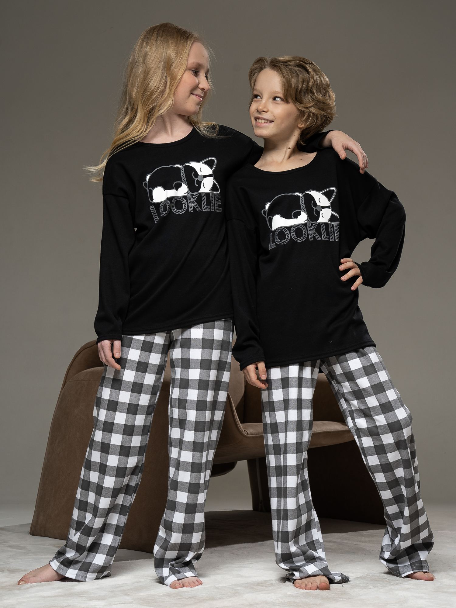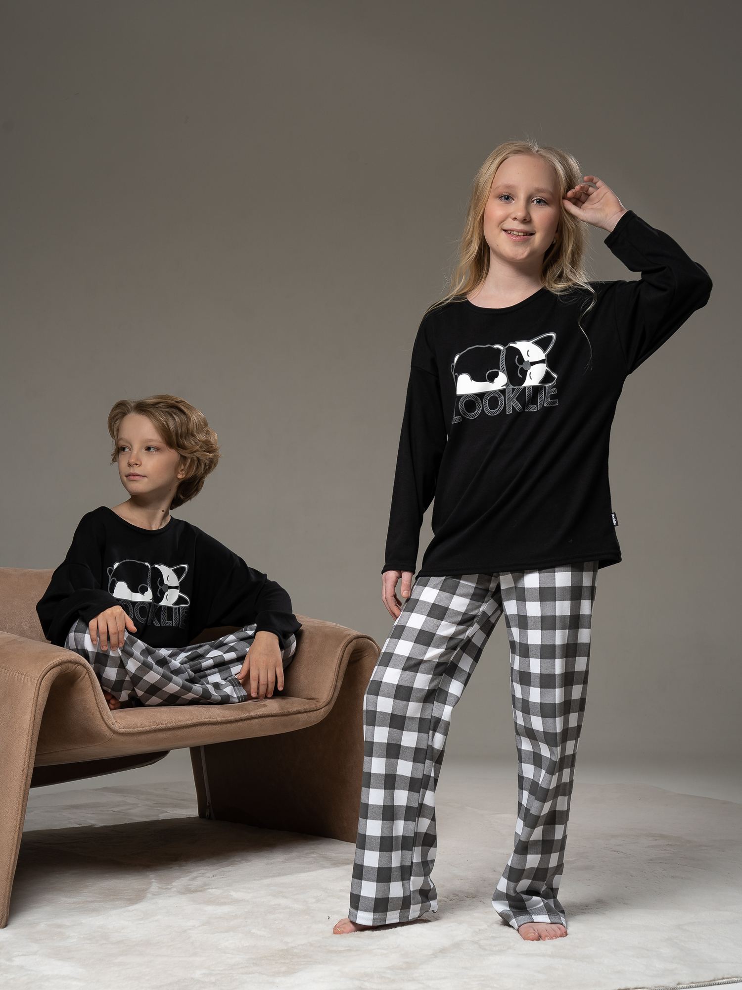 Пижама из интерлока черного цвета для девочки свободного силуэта . Состоит из толстовки и брюк . Толстовка с расширенной линией плеча, округлой горловиной и длинными рукавами. Прямые брюки с цельнокроенным поясом на резинке без бокового шва.