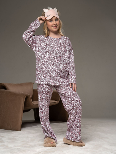 Пижама из интерлока белого цвета для девочки свободного силуэта . Состоит из толстовки и брюк . Толстовка с расширенной линией плеча, округлой горловиной и длинными рукавами. Прямые брюки с цельнокроенным поясом на резинке без бокового шва.