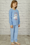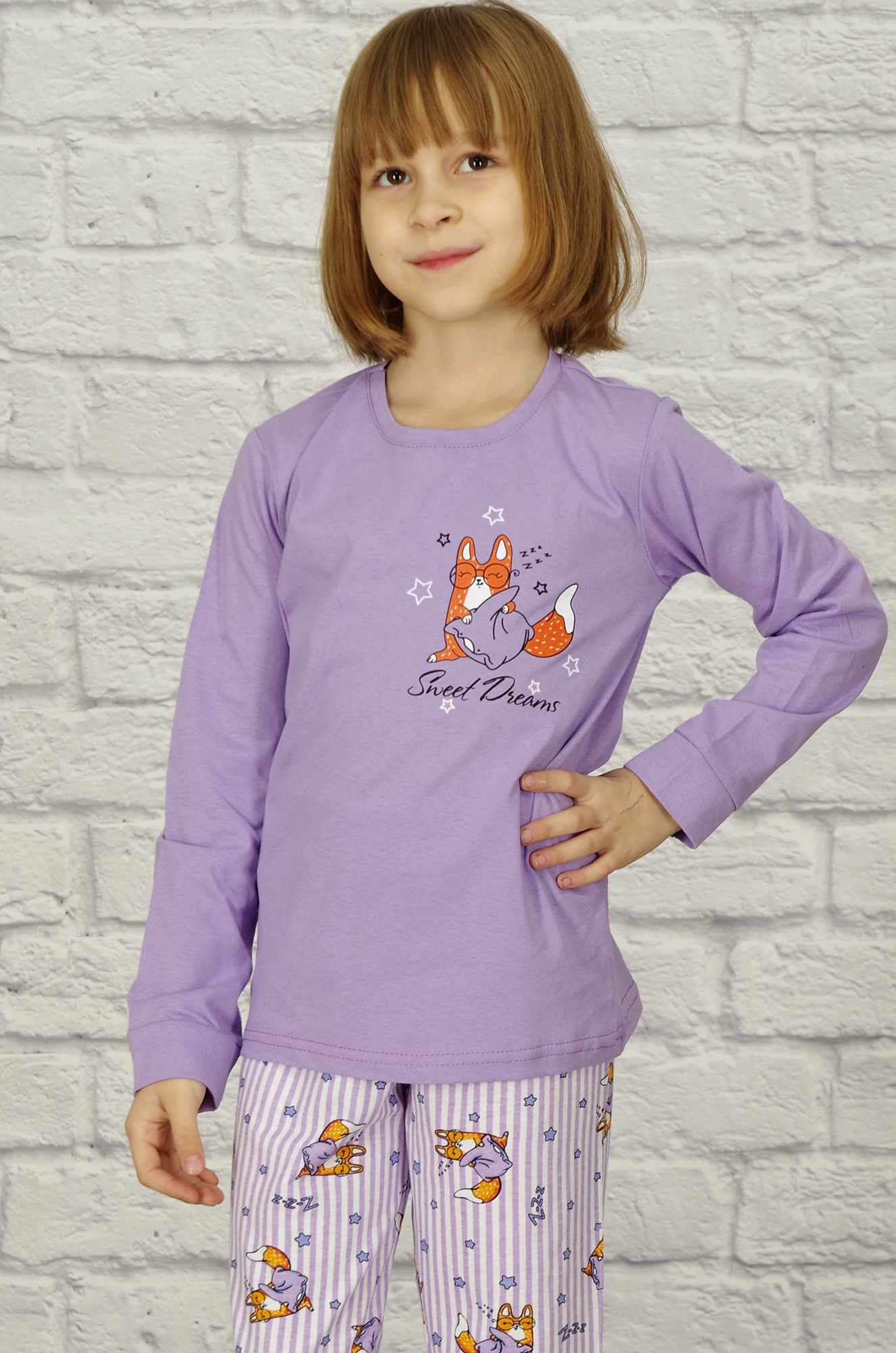 Уютная хлопковая пижамка для девочек. Футболка однотонная прямого кроя, с длинным рукавом на манжете, на полочке небольшой принт "симпатичный и милый лисёнок". Брючки из ткани с набивным рисунком, снизу на манжете. В таком комплекте можно не только спать, но и играть. Ткань кулирка - мягкая, приятная к телу и комфортная для сна.