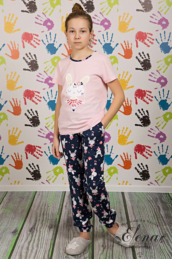 Костюм выполнен из х/б полотна, состоит из футболки и брюк. Футболка с принтом спереди, горловина обработана бейкой. Брюки с карманами по бокам, низ слегка присборен резинкой.
