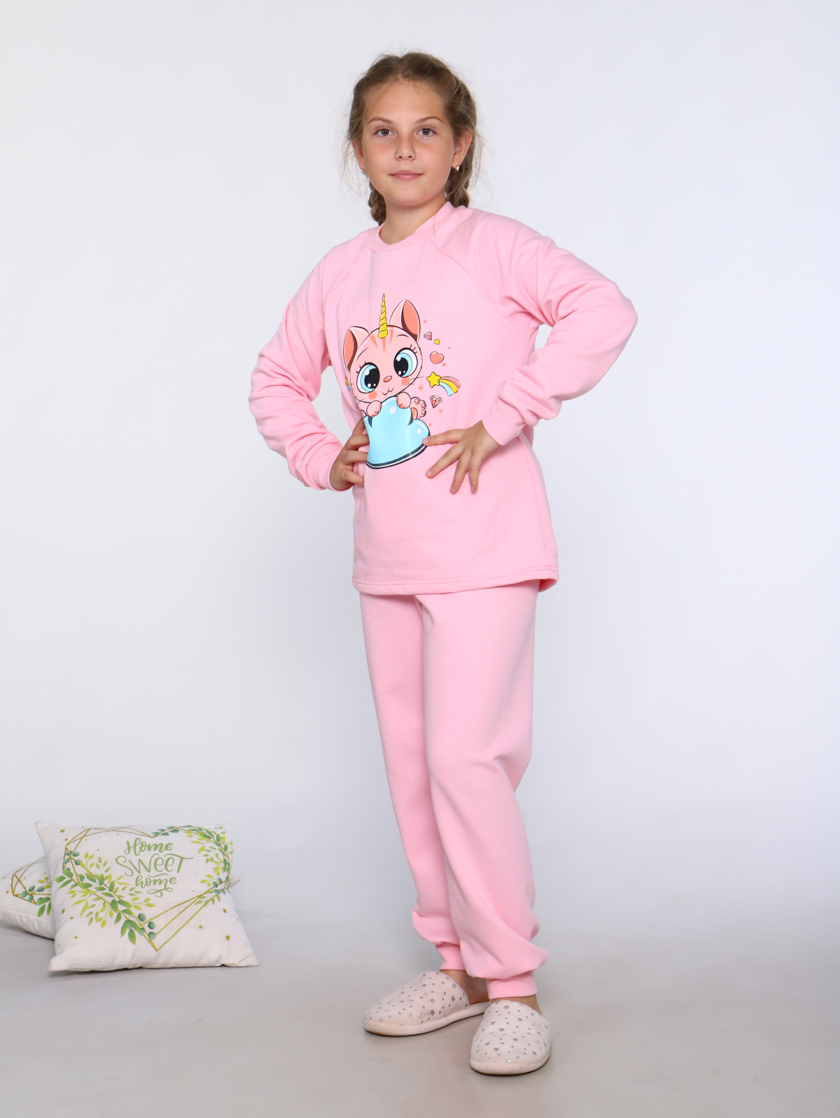 Пижама для девочки из мягкого и теплого трикотажа с начесом. Подходит для сна и просто как домашний костюм детский. Кофточка с длинным рукавом имеет круглый вырез.Низ рукава и низ брюк имеет манжет. В этой пижаме для подростков тепло, комфортно и уютно.Модель комплекта для дома сшита из 100% хлопка и дает усадку при стирке. Поэтому она сшита с запасом на усадку.