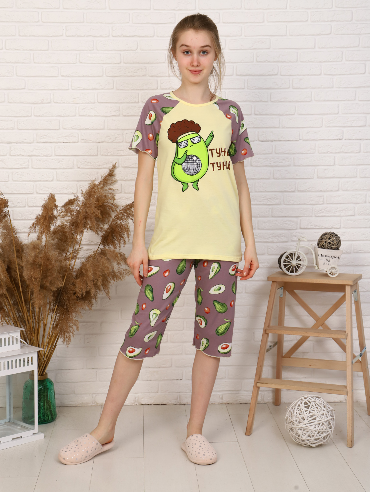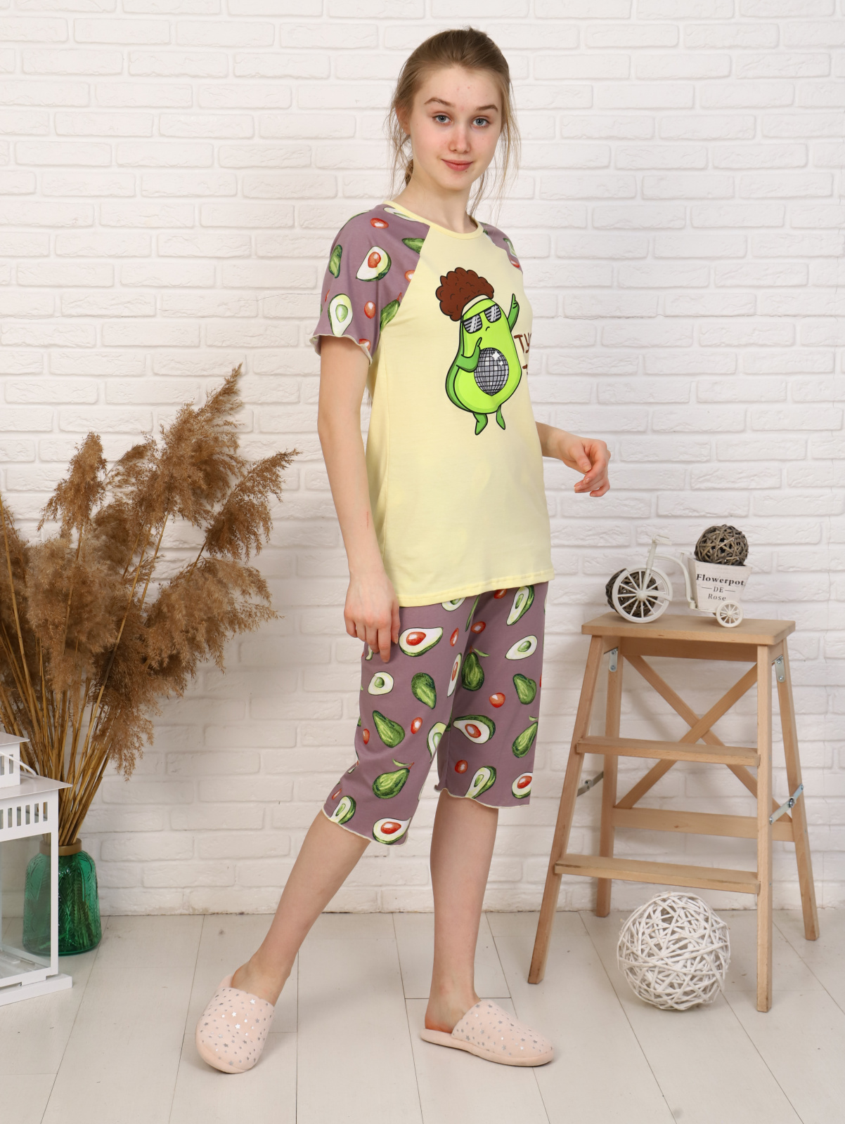 Пижама для девочки состоит из бридж и кофты свободного силуэта и модным в этом сезоне-авокадо.