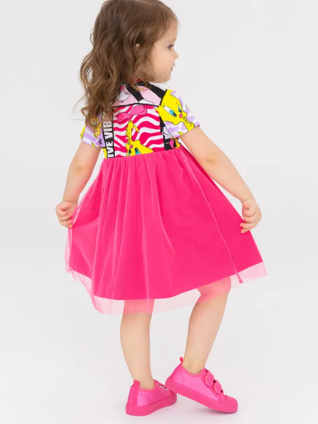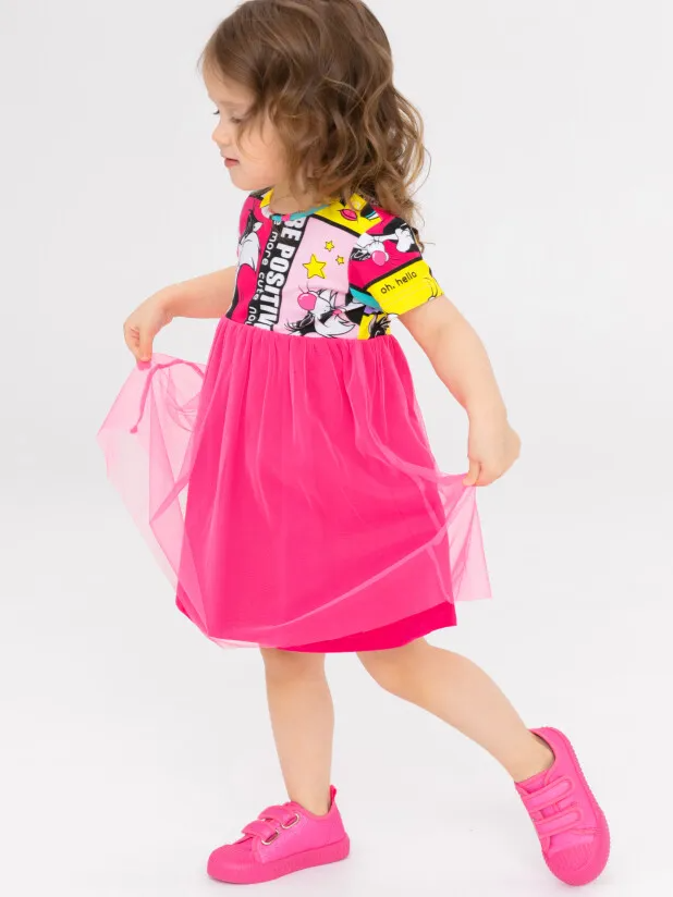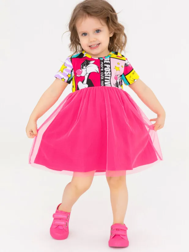Платье-боди трикотажное с юбкой из мягкой сетки. Застежка на кнопки на плече. Верх платья из качественного и приятного на ощупь трикотажа. Высокое содержание хлопка 95%. Благодаря наличию 5% эластана в составе ткани изделие держит форму.