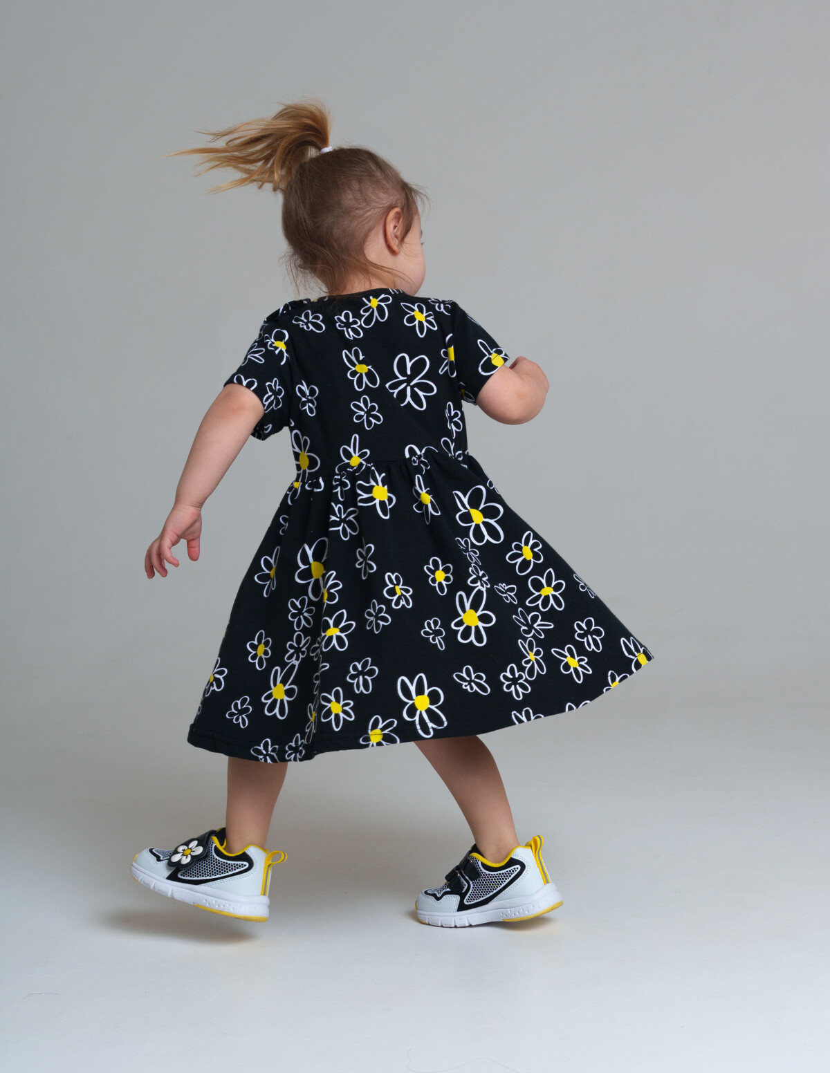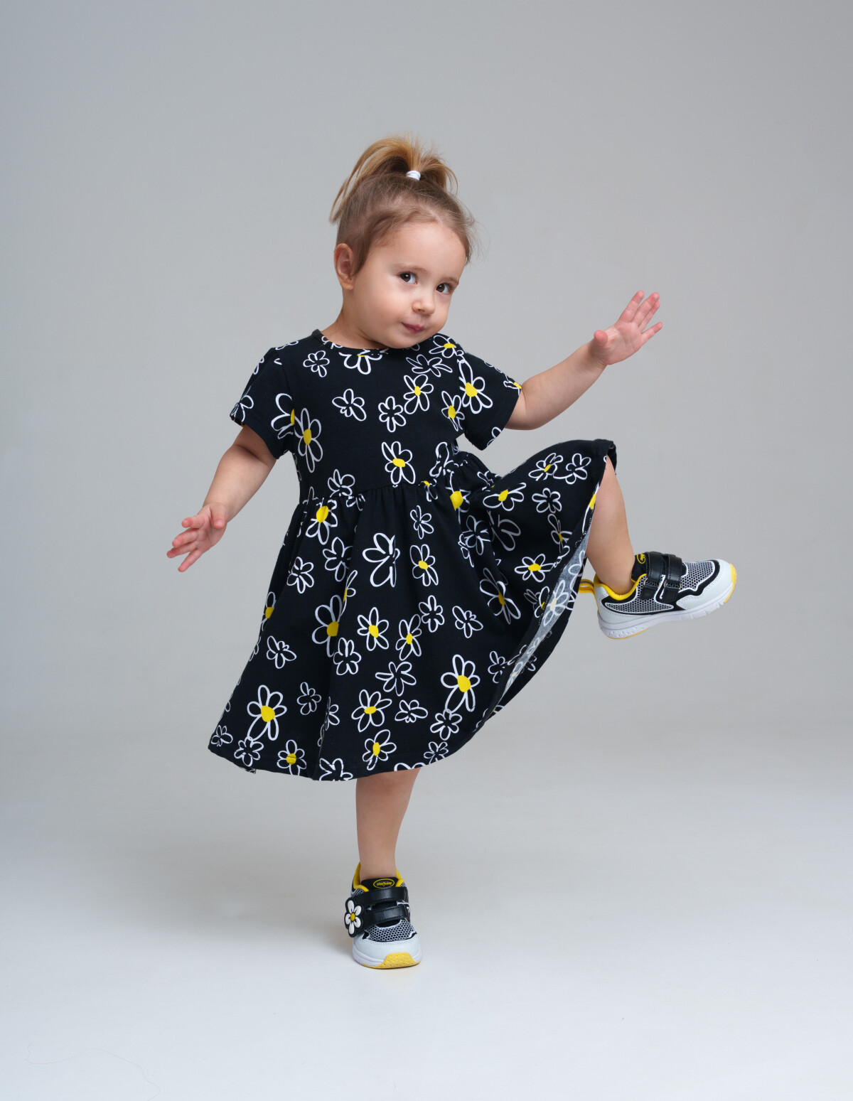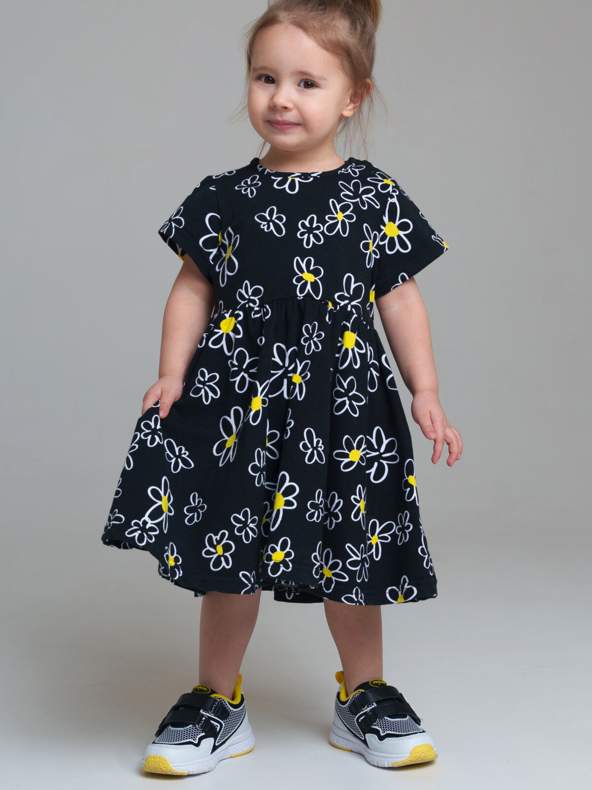Платье детское для девочки. Модель с высоким содержанием хлопка. Благодаря наличию эластана в составе ткани изделие держит форму и меньше мнется. Застежка на кнопки на плече. Модель выполнена из качественного и приятного на ощупь трикотажа.