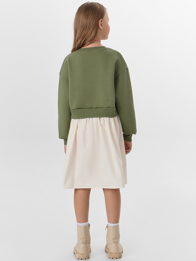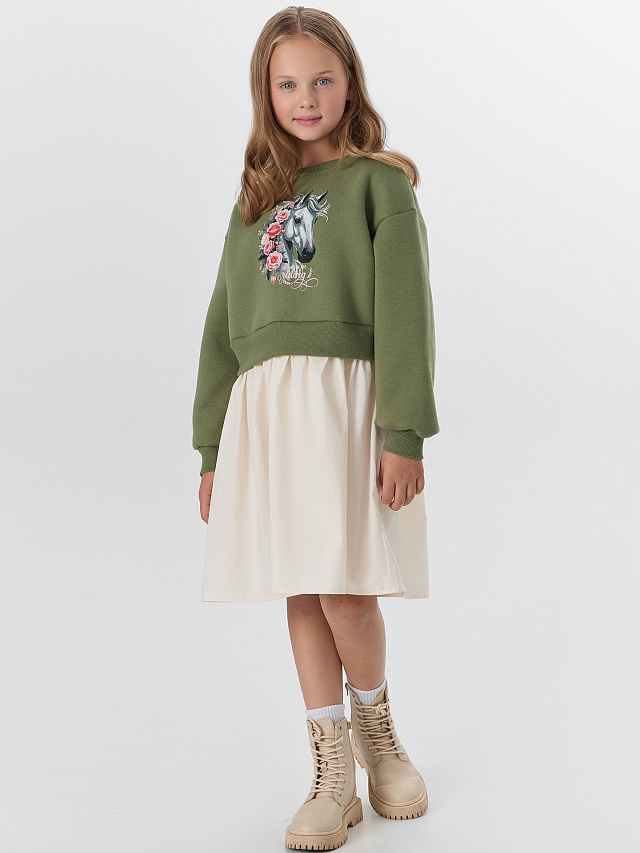 Платье для девочек свободного кроя сочетает в себе два материала: верхняя часть из мягкого футера с начесом и пышная юбка из легкого поплина. Круглая горловина с отделкой из рибаны обеспечивает комфорт при носке. Модель с отрезной линией талии и сборчатым низом создает нежный силуэт.