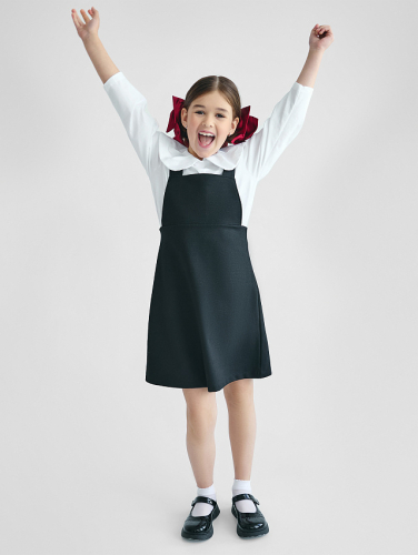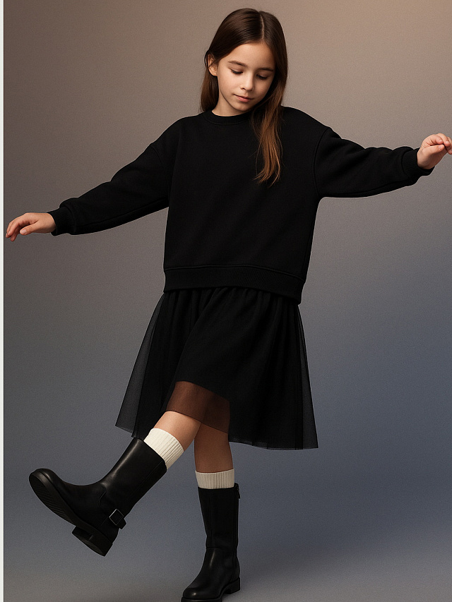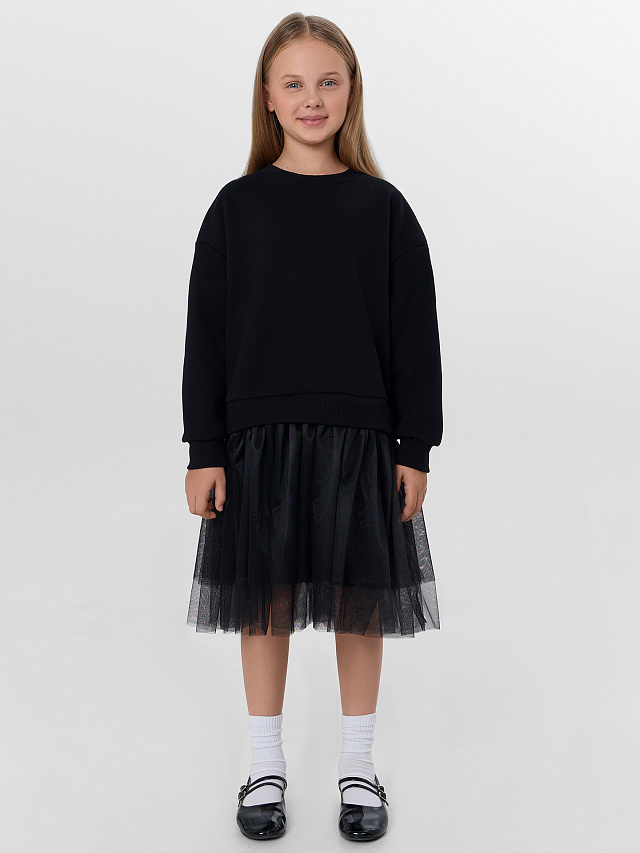 Платье для девочек свободного силуэта. Рукава втачные длинные, с отрезными манжетами из рибаны. Плечо слегка спущено. Горловина округлый формы с обтачкой из рибаны. Низ изделия обработан рибаной .
