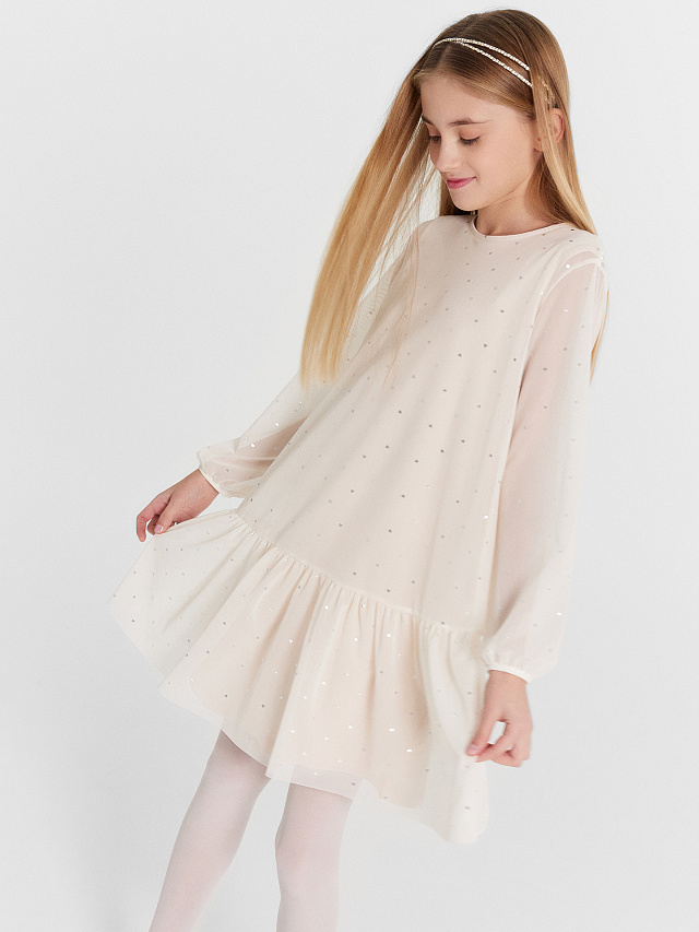 Нарядное платье А-образного силуэта для девочек. Изготовлено из полупрозрачной воздушной сетки с подкладкой из хлопковой кулирки. Вырез круглый, классический. На спинке застегивается на пуговицу. Рукава объемные, длинные. Отличный вариант для утренников и праздников!