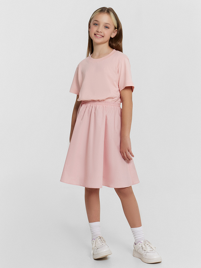 Платье для девочек полуприлегающего силуэта. Верх платья из трикотажного кулирного полотна .Горловина круглая окантована обтачкой из рибаны. Рукав, втачной короткий.