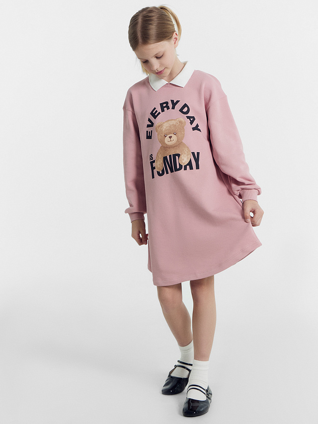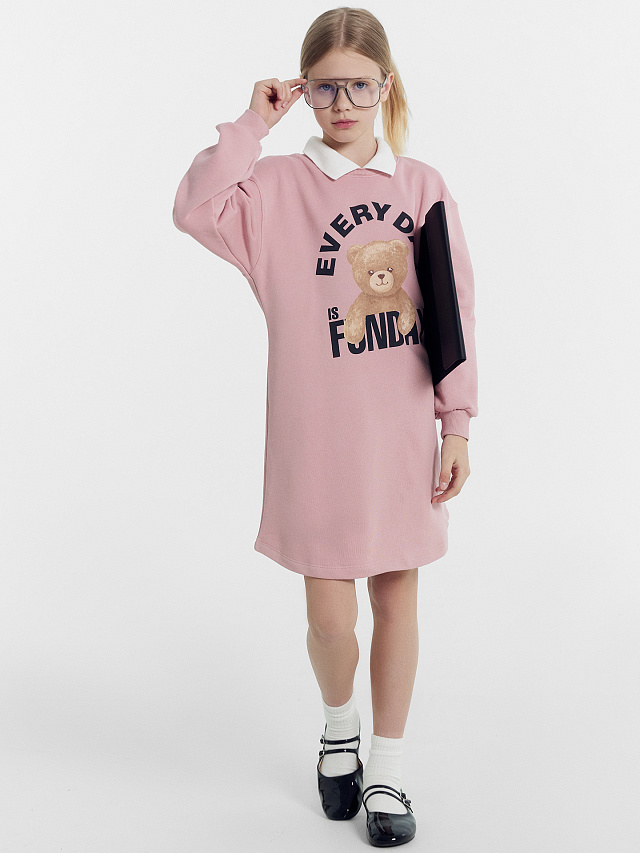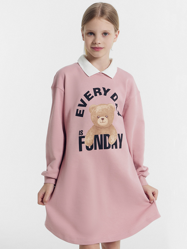 Стильное детское платье для девочек свободного силуэта. Выполнено из футера без подчеса с печатью в виде мишки и надписи "Every day is funday / Каждый день - веселье". В составе изделия - натуральный хлопок. Горловина круглой формы из трикотажного полотна рибаны. В горловину втачан воротник. Рукава длинные. Линия плеча спущена. По низу рукавов - манжеты из трикотажного полотна рибаны. Низ изделия фигурный. Длина платья выше колена. Материал очень приятный к телу, хорошо пропускает воздух, что позволяет чувствовать комфорт в любое время года. Мягкое, слегка эластичное, отлично сидит по фигуре, не стесняет движений. Представлено в разных цветах. Рекомендуем!