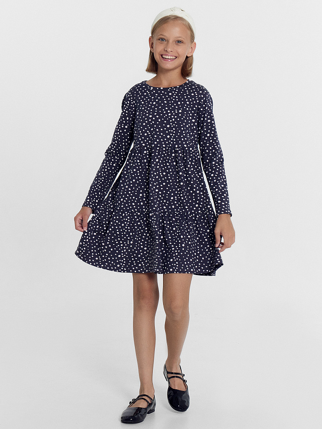 Это прелестное платье с отрезными воланами станет прекрасным дополнением к гардеробу вашей девочки. Выполненное из высококачественного 100% хлопка, оно обеспечивает исключительный комфорт и свободу движений, позволяя коже ребенка дышать. Изящный, полуприлегающий силуэт платья создаст женственный и элегантный образ. Длинные рукава и круглый вырез горловины гарантируют свободу движений. Оригинальный принт придает модели особенный шарм и индивидуальность. Благодаря продуманному крою и качественному пошиву, платье идеально садится по фигуре, обеспечивая комфорт и свободу на протяжении всего дня. Оно одинаково уместно как для повседневных прогулок, так и для праздничных мероприятий. Сочетайте его с колготками, кардиганами и туфельками для создания стильных образов!