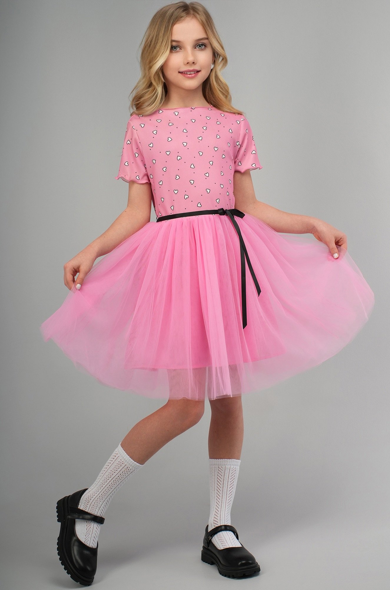 Розовое платье с сердечками — это нежность, уют и торжественность в одном образе. Вечернее воздушное платье идеально подойдет для выступлений в садике.