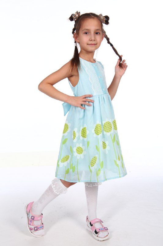 Нежное и воздушное летнее платье без рукавов. На груди декоративные пуговки и кружево, на спинке застежка на пуговки до талии, а поясок завязывается в красивый бантик.