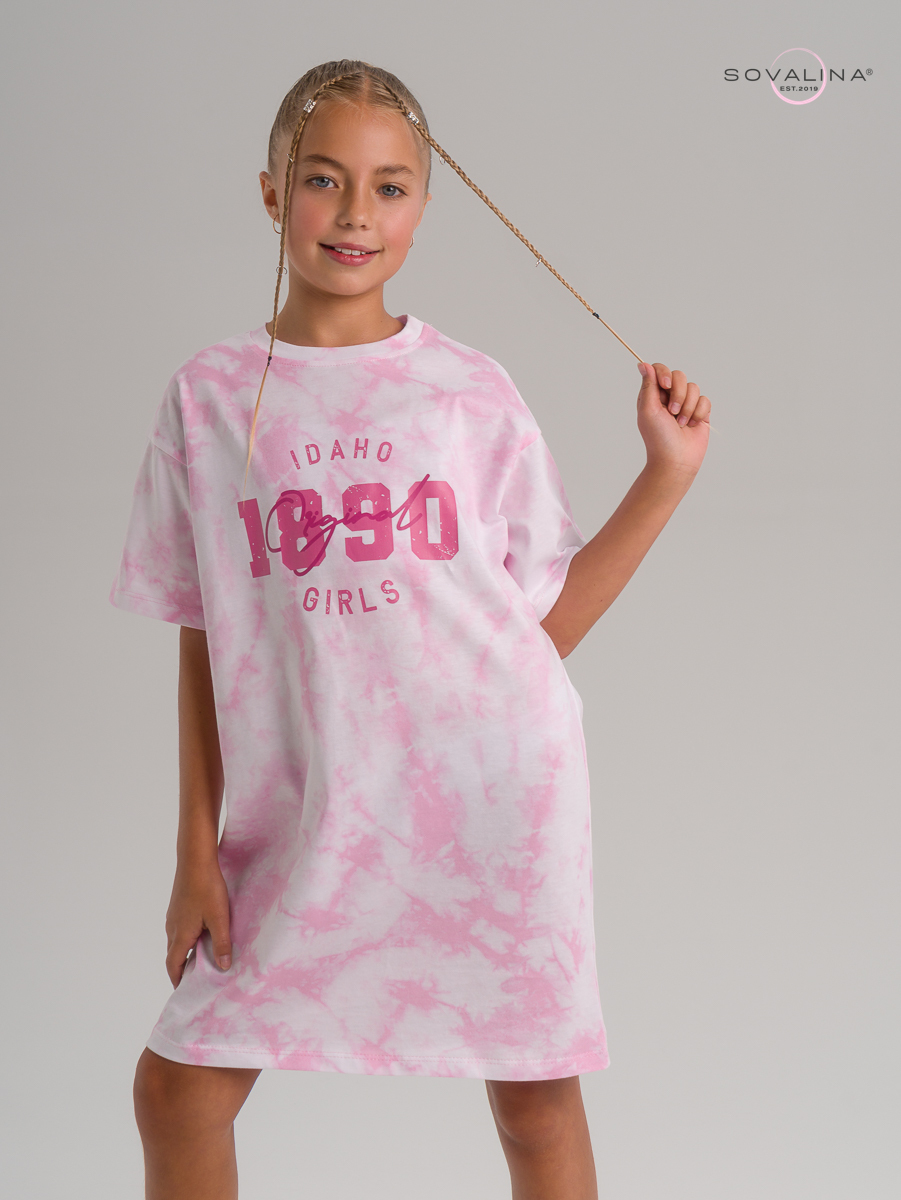 Трикотажное платье-футболка для девушек подростков и совсем юных девочек ТМ SOVAlina. Благодаря натуральному составу из хлопка, этот мягкий материал гарантирует гипоаллегенность и позволяет коже дышать, что особенно важно для детей. Такое легкое и широкое платье удобно не только осенью или зимой в отопительный сезон, но и весной, летом — в любое время года вашему ребенку будет уютно. Прямой фасон оверсайз создает эффектный современный образ и дарит комфорт даже во время длительных мероприятий, а актуальный принт добавит оригинальности. Повседневный яркий наряд будет уместен для любого случая. Идеально подойдет и на выход, и для дома. Свободный широкий крой платья подходит для разных типов фигуры и не стесняет движений. Также, это отличный подарок дочке, внучке или крестнице. Обращаем Ваше внимание, фото выполнено в условиях студийного освещения, при естественном свете цвета могут незначительно отличаться. 100% хлопок