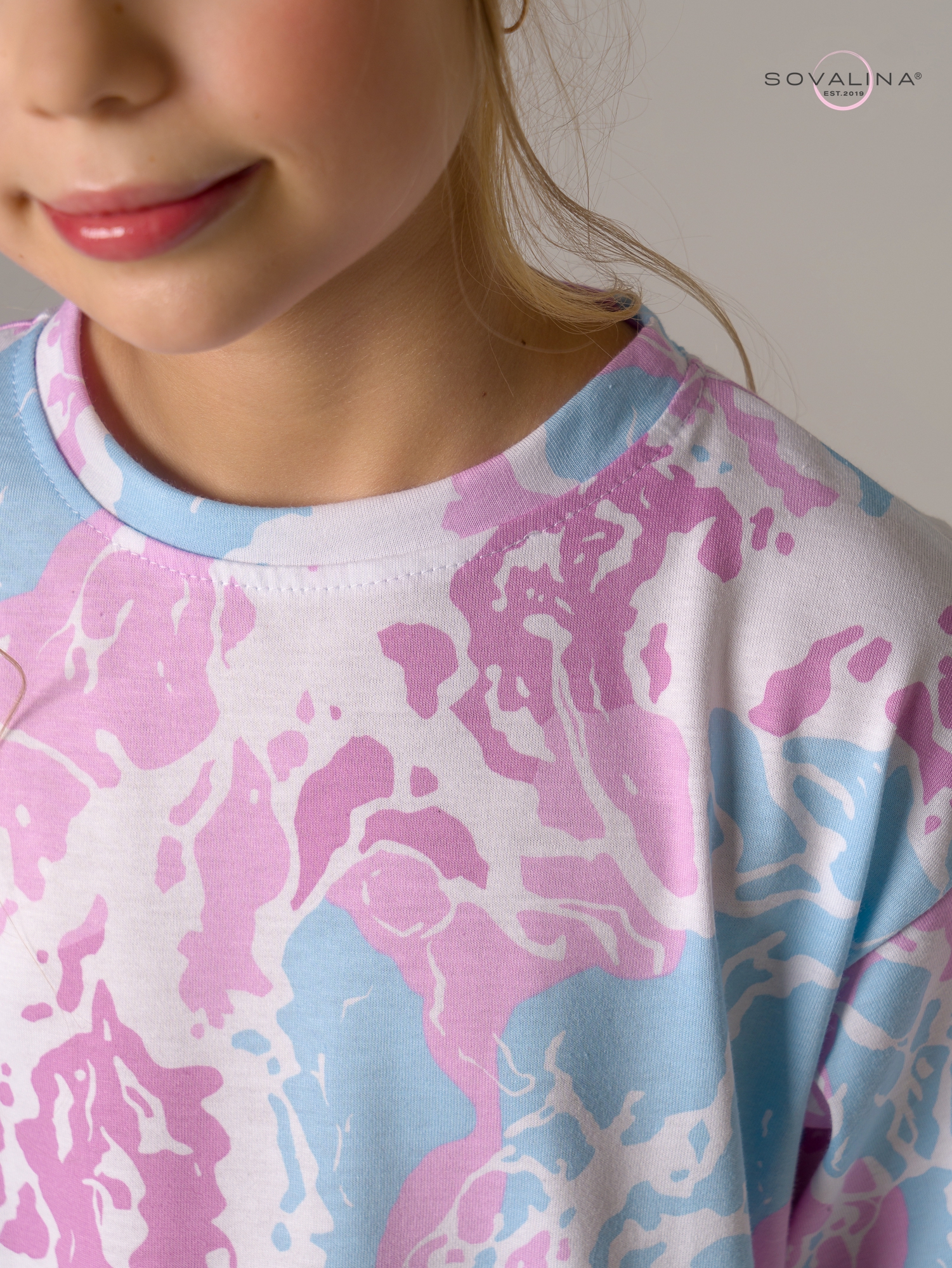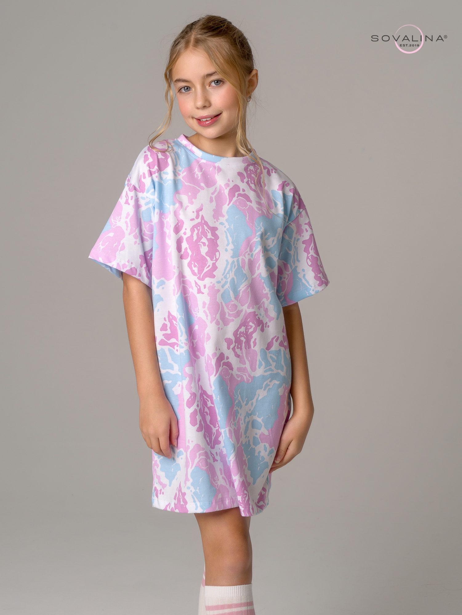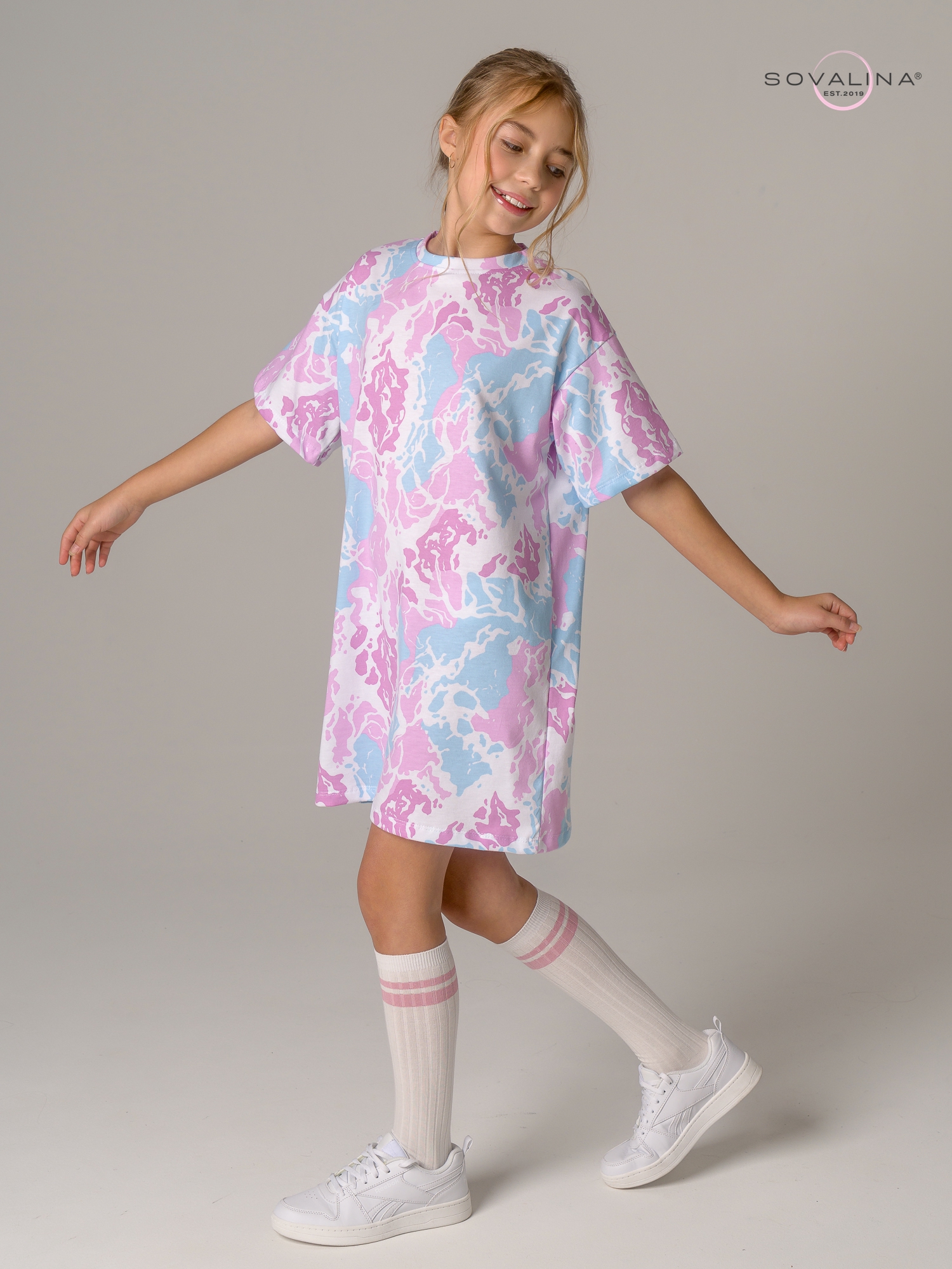 Трикотажное платье-футболка для девушек подростков и совсем юных девочек ТМ SOVAlina. Благодаря натуральному составу из хлопка, этот мягкий материал гарантирует гипоаллегенность и позволяет коже дышать, что особенно важно для детей. Такое легкое и широкое платье удобно не только осенью или зимой в отопительный сезон, но и весной, летом — в любое время года вашему ребенку будет уютно. Прямой фасон оверсайз создает эффектный современный образ и дарит комфорт даже во время длительных мероприятий, а актуальный принт добавит оригинальности. Повседневный яркий наряд будет уместен для любого случая. Идеально подойдет и на выход, и для дома. Свободный широкий крой платья подходит для разных типов фигуры и не стесняет движений. Также, это отличный подарок дочке, внучке или крестнице. Обращаем Ваше внимание, фото выполнено в условиях студийного освещения, при естественном свете цвета могут незначительно отличаться. 100% хлопок