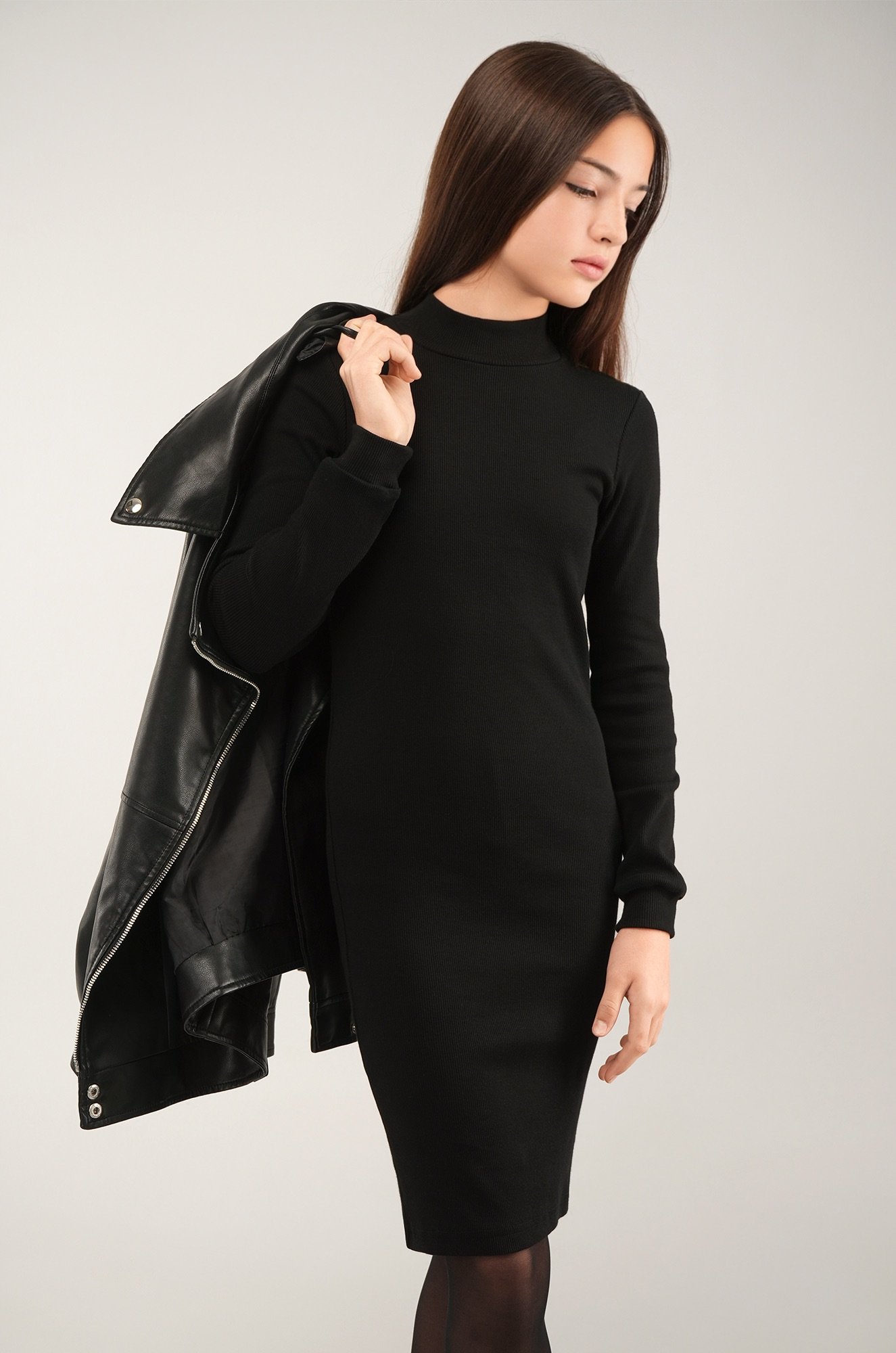 Стильная, дерзкая, романтичная – в таком черном платье ты можешь быть какой угодно! Детское платье-водолазка для девочек и девочек-подростков выполнено из плотной трикотажной ткани кашкорсе. Облегающий силуэт, длинный рукав, воротник стойка и фактура в рубчик – каждая деталь делает платье для детей элегантным.