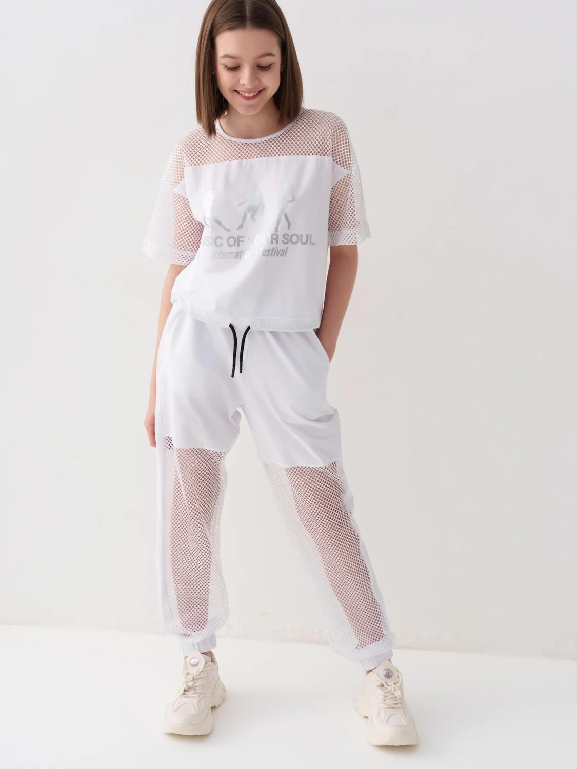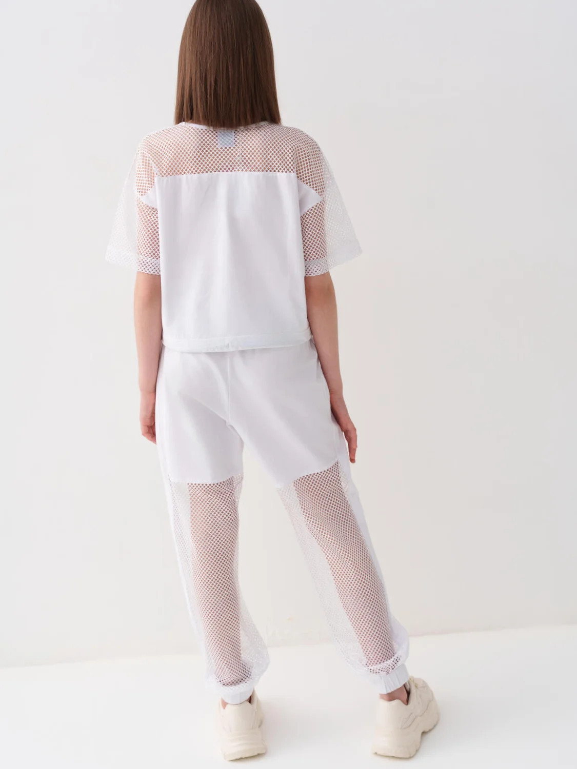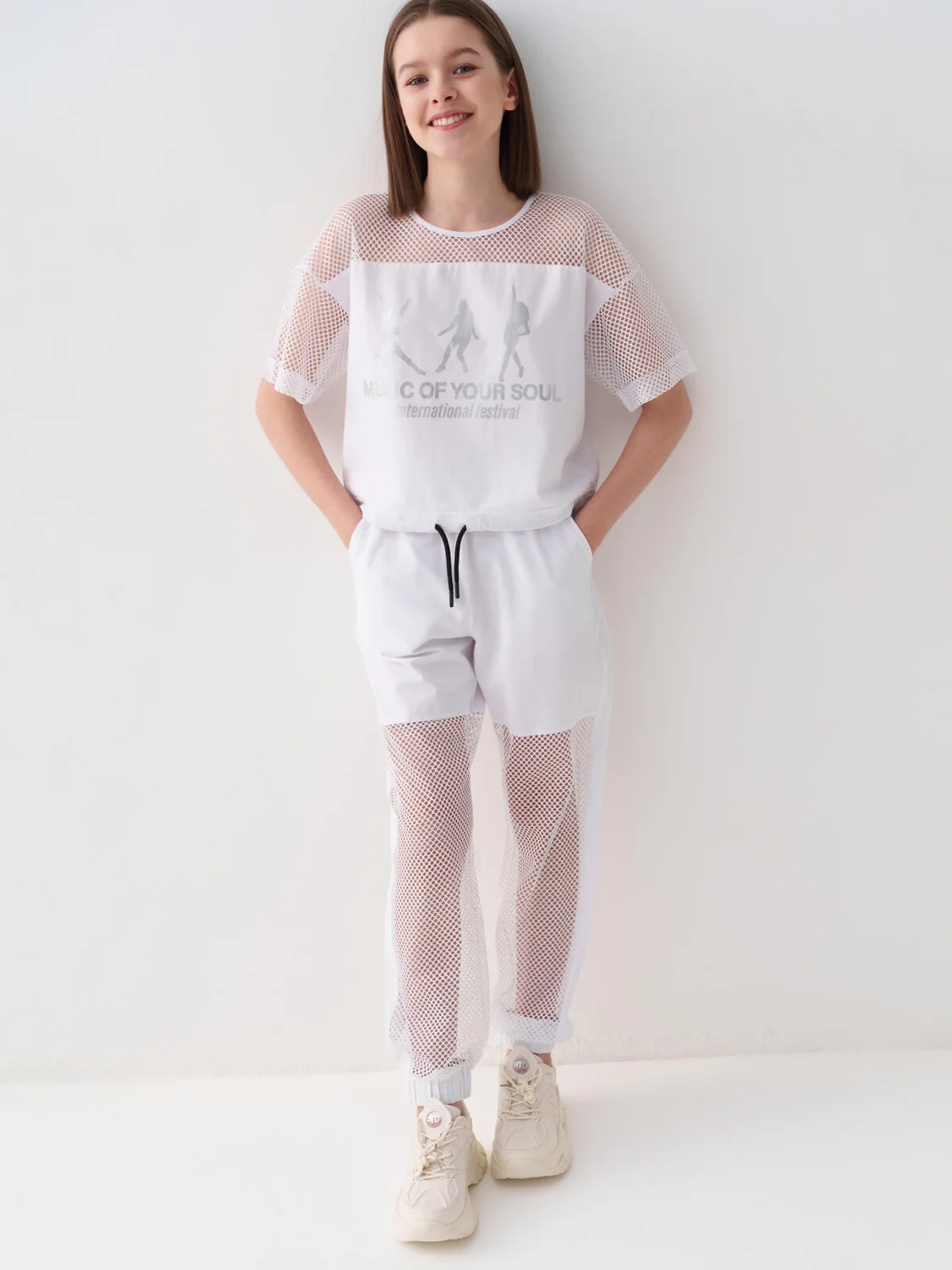 Стильные брюки для девочки подростка. Верхняя часть выполнена из плотного хлопкового трикотажа, а нижняя — из легкой прозрачной сетки, создающей модный контраст и эффект "двойного слоя". Брюки имеют эластичный пояс со шнурком и удобные боковые карманы. Низ брючин собран на резинку, благодаря чему брюки хорошо сидят по фигуре. По бокам и передней части расположены лампасы, добавляющие спортивный акцент.