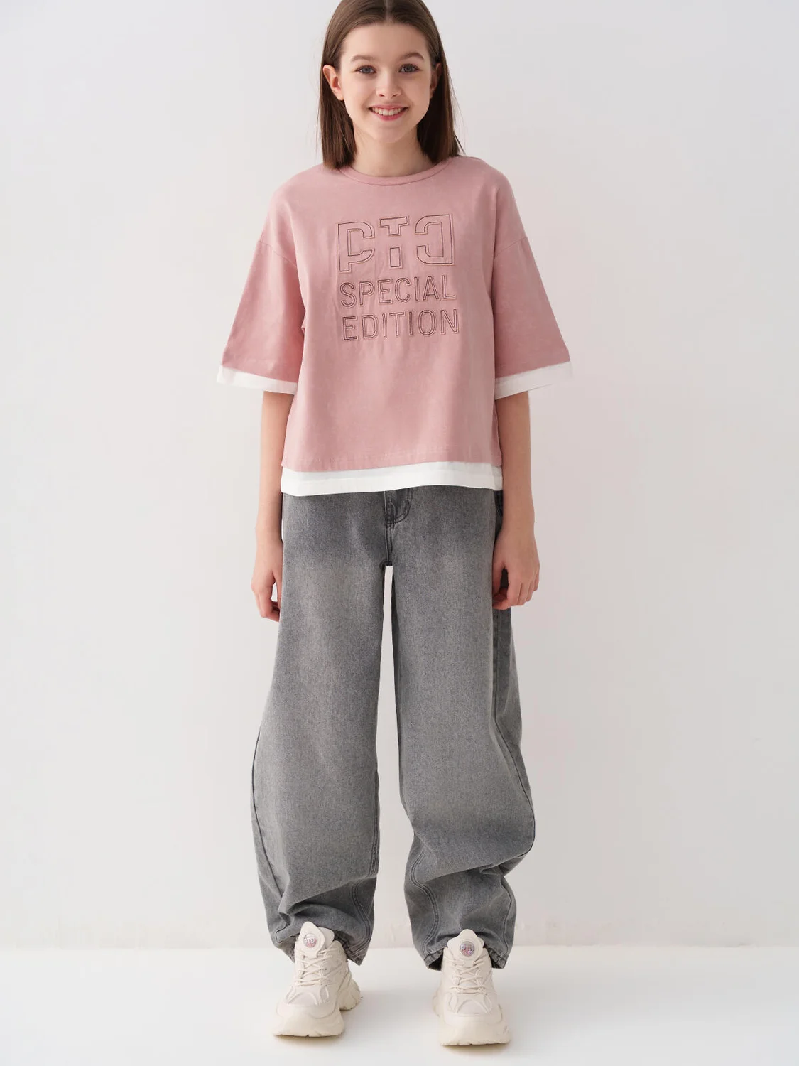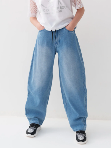 Джинсы багги для девочки подростка. Свободный крой baggy, выполнены из вареного серого денима. Спереди удобные боковые карманы, сзади — накладные. Застежка на молнию и болт. На поясе предусмотрена регулировка за счёт внутренней резинки с пуговицей. Украшены декоративным лейблом на спинке. Отличный вариант для повседневной носки в весенне-летний сезон.