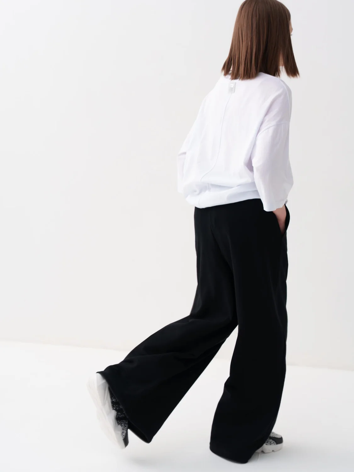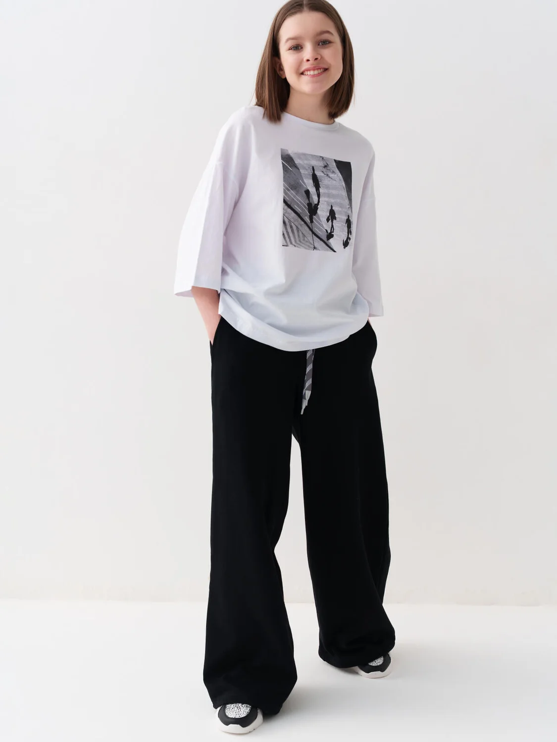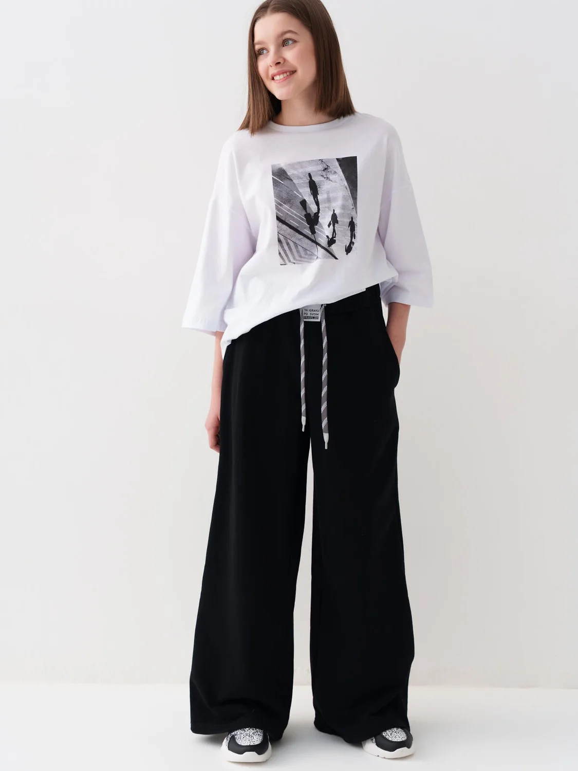 Спортивные широкие брюки для девочки подростка. Выполнены из мягкого хлопкового трикотажа футер без начеса. Пояс на резинке для удобства и регулировки предусмотрен шнур. По бокам расположены карманы. Спереди, на поясе - декоративная нашивка.
