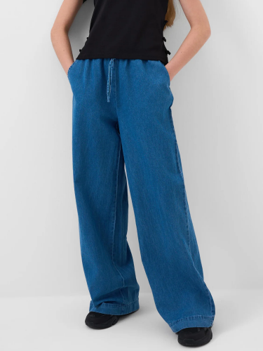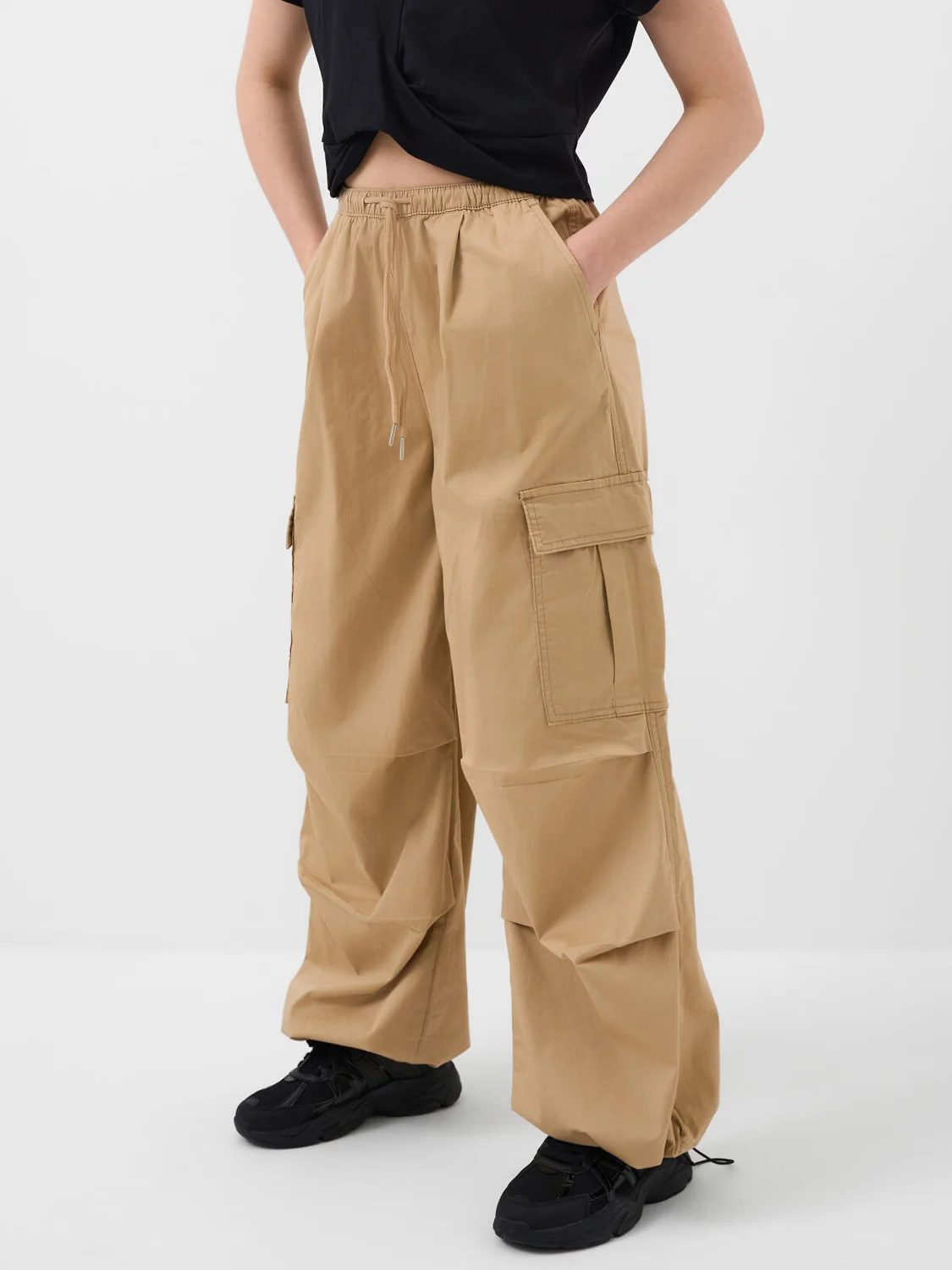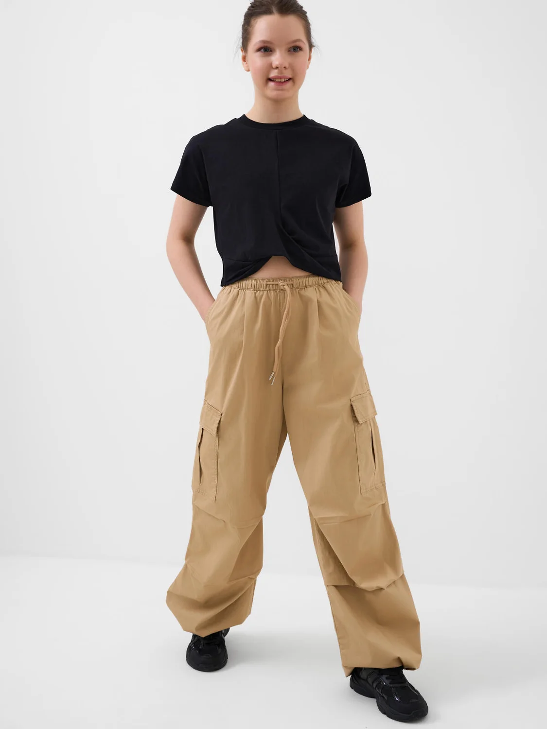Брюки карго для девочки подростка. Выполнены из плотного хлопкового твилла. Модель имеет заниженную посадку и свободный крой с утяжками внизу, которые позволяют регулировать ширину брючин. Пояс на резинке с дополнительной регулировкой шнуром. На бедрах расположены накладные карманы на липучке, а также боковые карманы.