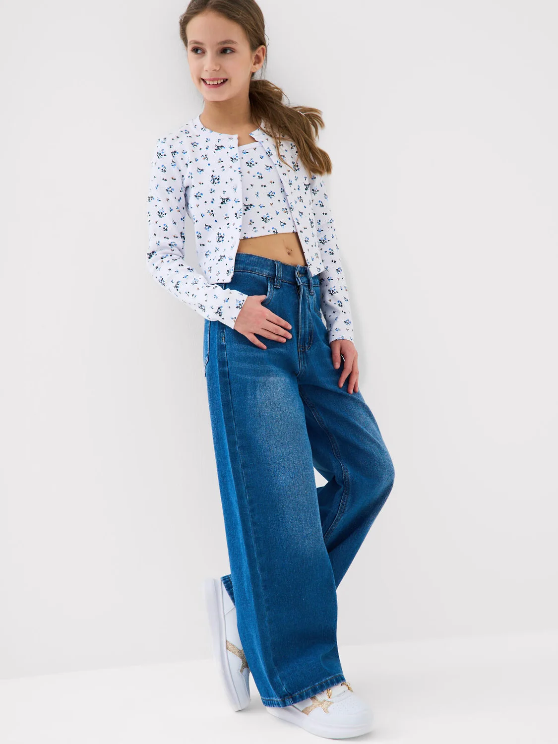 Джинсы свободные для девочки подростка. Модель с высокой посадкой и широкими прямыми штанинами. Застежка — молния и болт. Пояс частично на резинке сзади и регулируется изнутри с помощью пуговиц. Модель выполнена из синего денима. Есть передние и задние карманы.