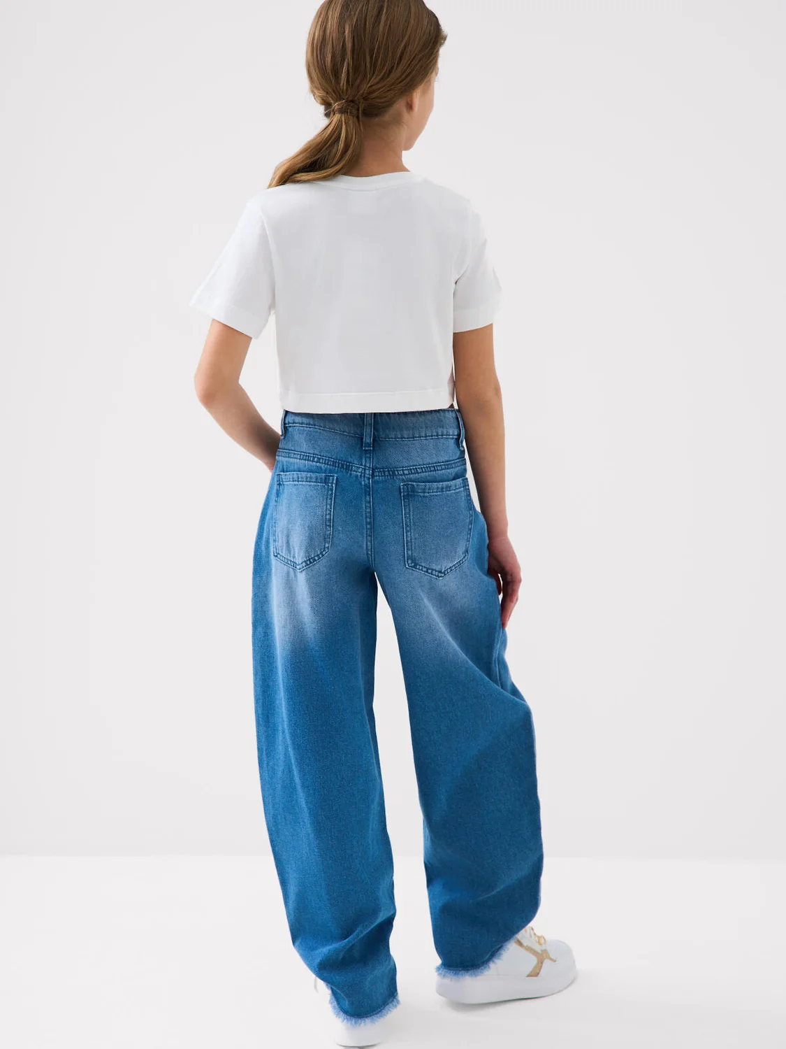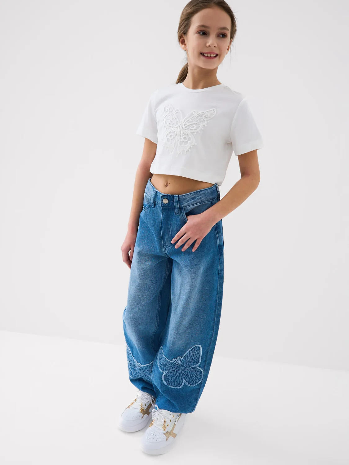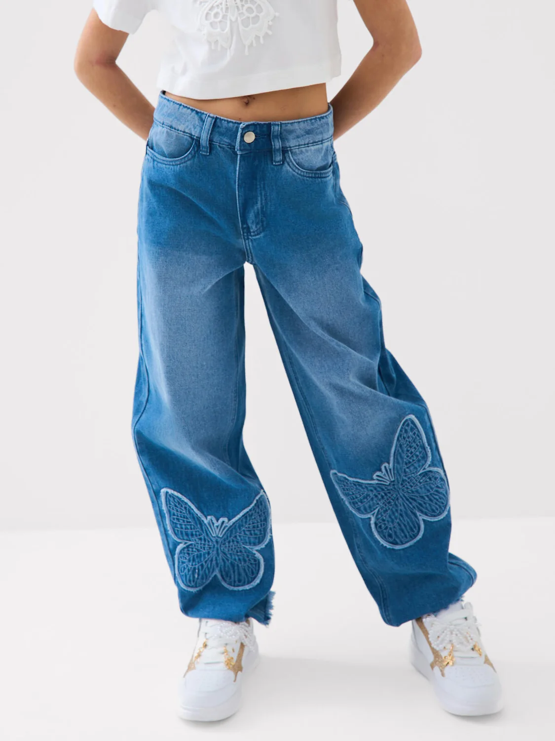 Джинсы багги для девочки подростка. Широкие джинсы из светло-синего денима с оригинальной посадкой: свободные по бедрам и немного зауженные к щиколотке. Спереди — два боковых кармана, сзади — два накладных. Застежка — на молнию и болт. По талии предусмотрен регулируемый внутренний пояс на резинке. Эффектные декоративные бабочки, выполненные в виде объемной вышивки с вырезанными краями, расположены на коленях.