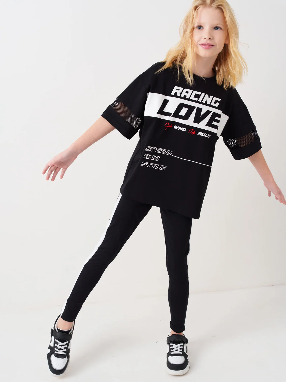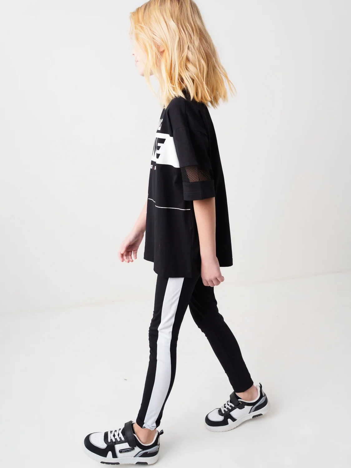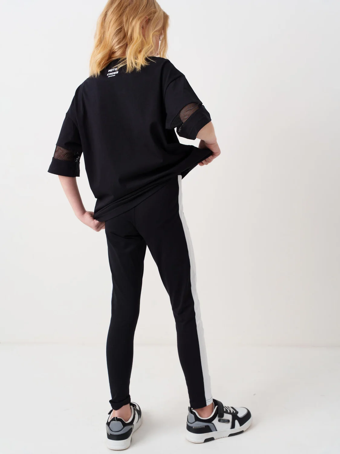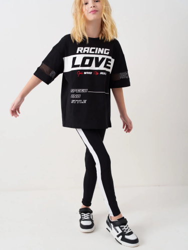 Черные легинсы для девочки подростка. Модель с белыми лампасами по бокам. Изделие выполнено из эластичного, хлопкового трикотажа, хорошо облегает фигуру и имеет высокую посадку. На талии — комфортный эластичный пояс. Длина — до щиколотки.
