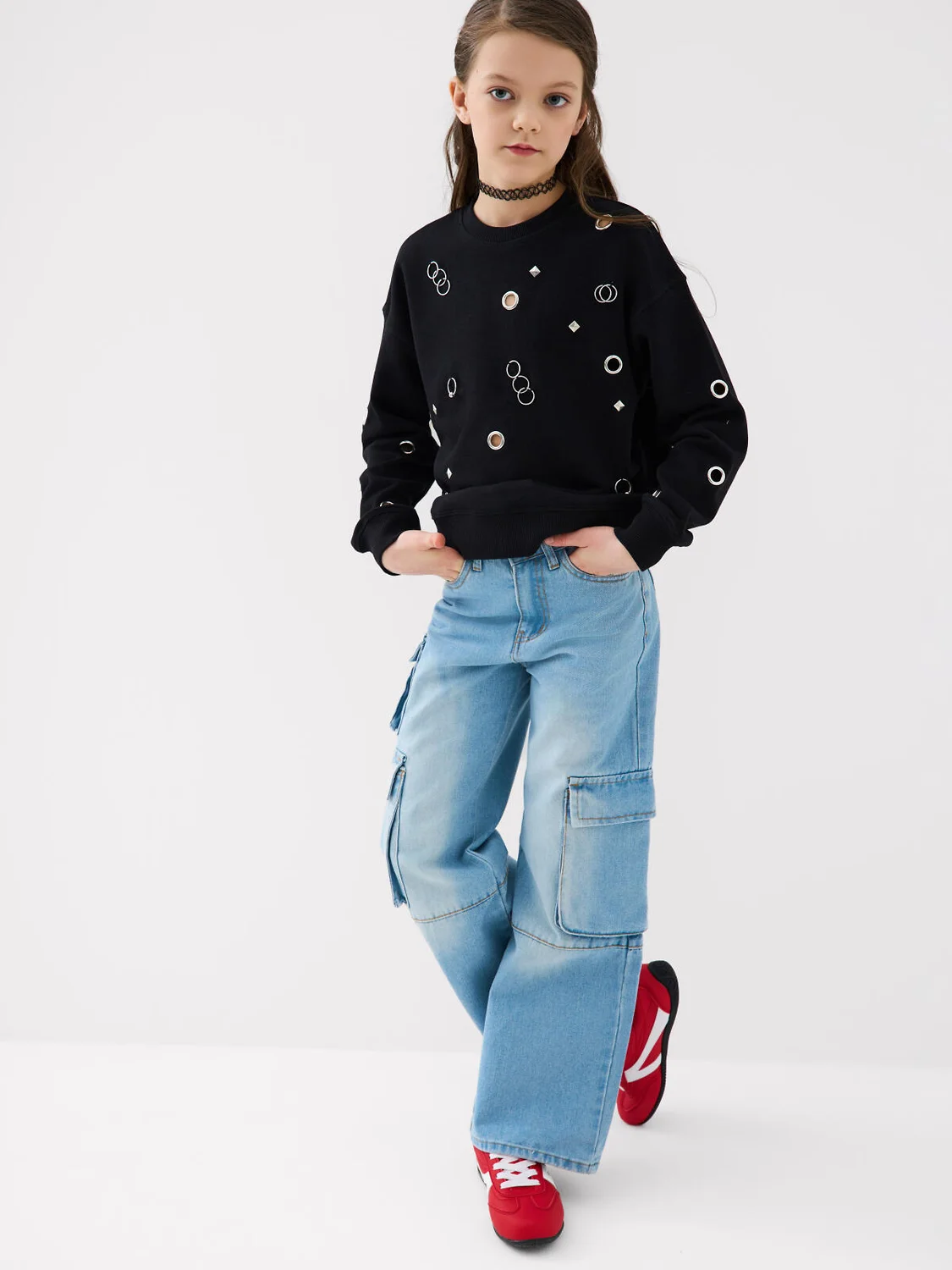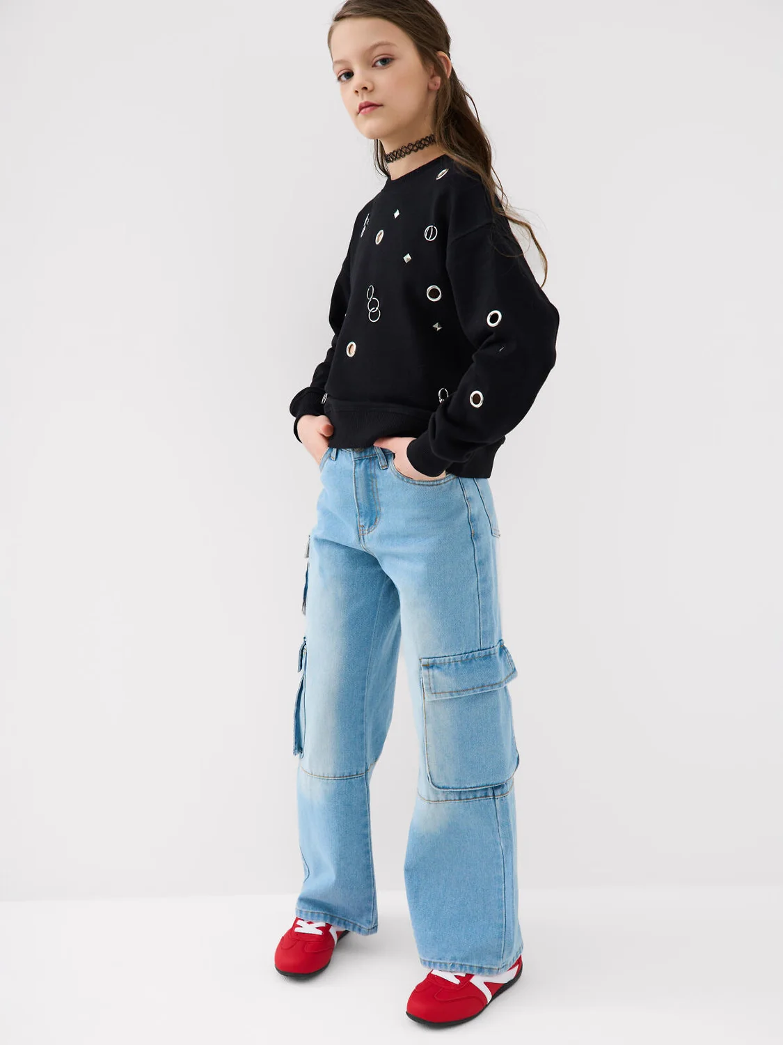 Джинсы карго для девочки подростка. Выполнены из классического синего денима и имеют прямой свободный крой. Джинсы застёгиваются на молнию и болт. Внутри пояса есть регулируемая резинка с пуговицей для удобства посадки. Благодаря большому количеству карманов — два спереди, два сзади и по два боковых — модель выглядит современно и функционально. Декоративные элементы варки придают джинсам модный винтажный вид.