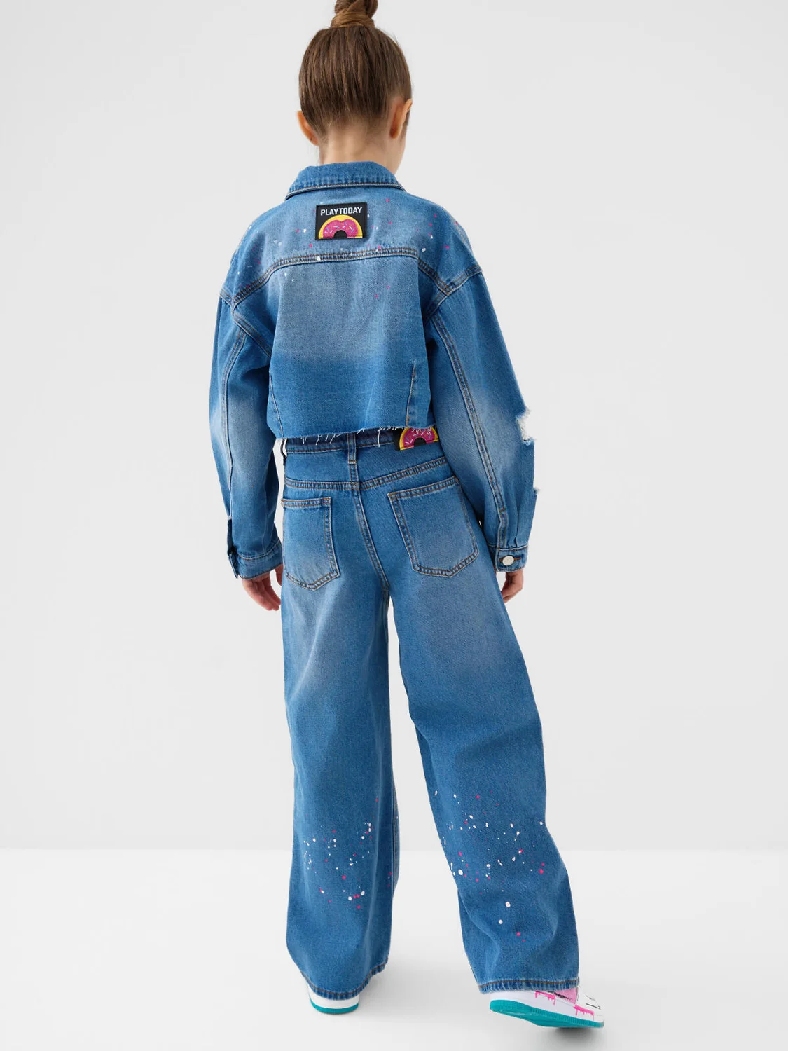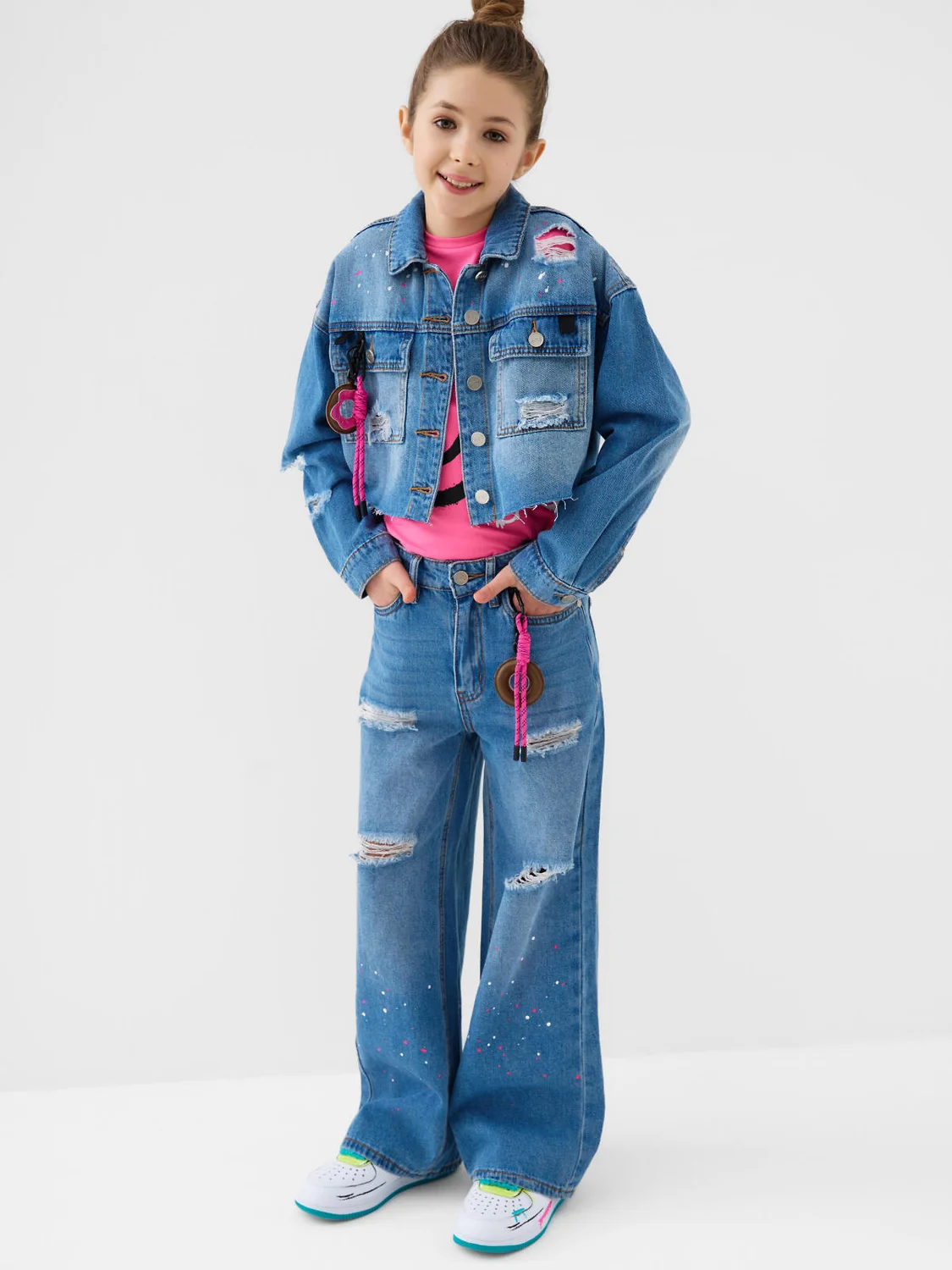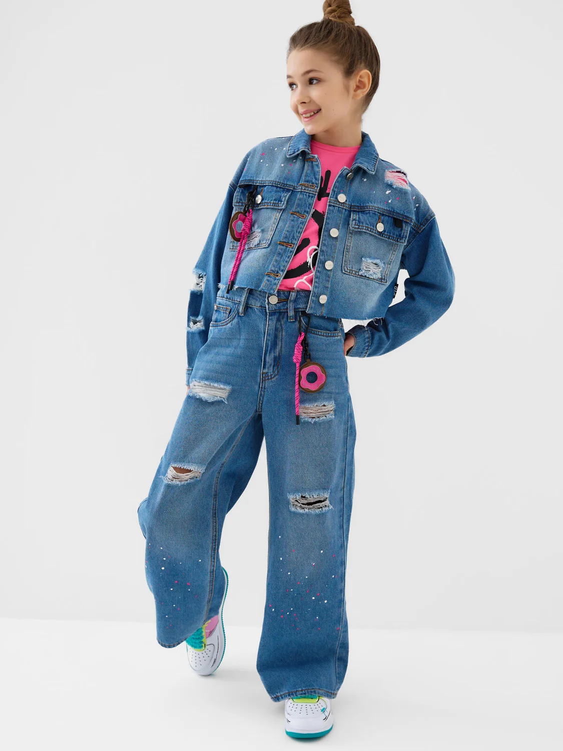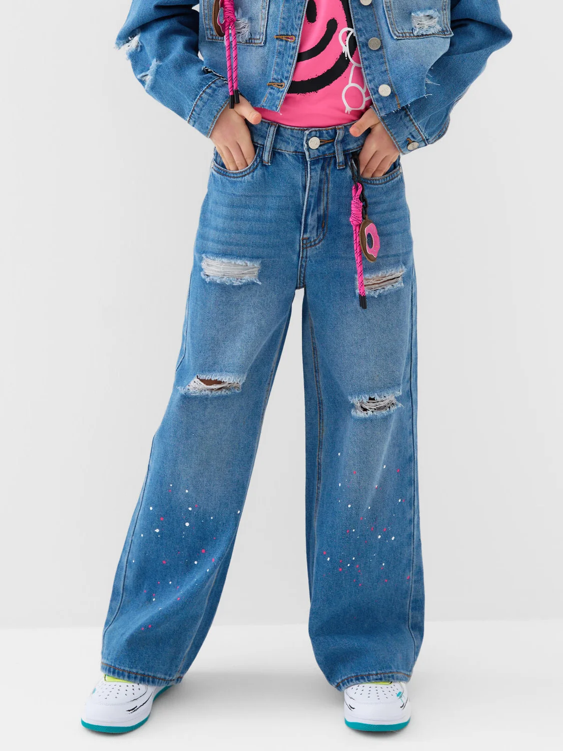 Широкие джинсы для девочки подростка. Застёжка на молнию и болт. В поясе предусмотрена внутренняя регулировка объёма с помощью резинки и пуговиц. Модель wide leg прямого кроя выполнены из варёного светло-синего денима. Спереди имеется принт из ярких белых и розовых капель, нанесённых на нижнюю часть штанин — спереди и сзади. Два передних и два задних кармана. В комплекте — съёмный яркий брелок на поясе.