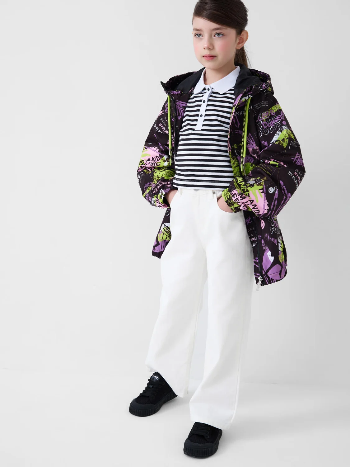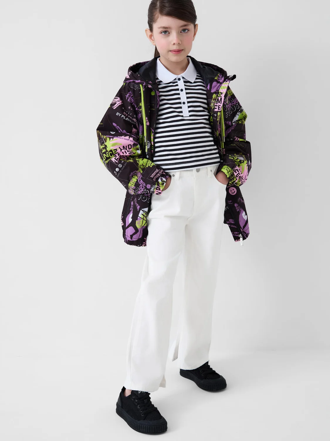 Прямые джинсы свободного кроя для девочки подростка. Модель выполнена из классического белого денима, имеет высокую посадку. Джинсы застёгиваются на молнию и болт. Пояс регулируется с помощью внутренней эластичной ленты и пуговиц, что позволяет подстроить изделие по фигуре. Спереди расположены два стандартных кармана и небольшой монетный кармашек, сзади — два накладных кармана. Брендированная этикетка на заднем кармане.
