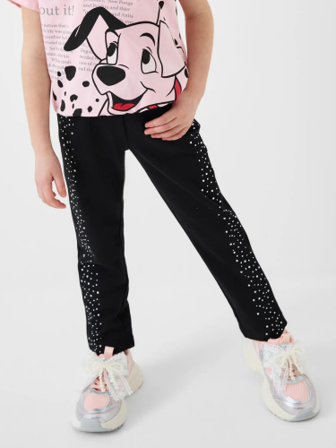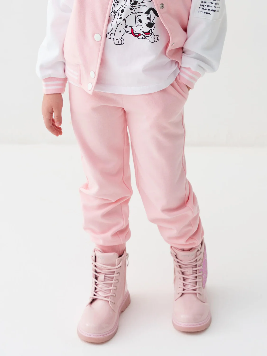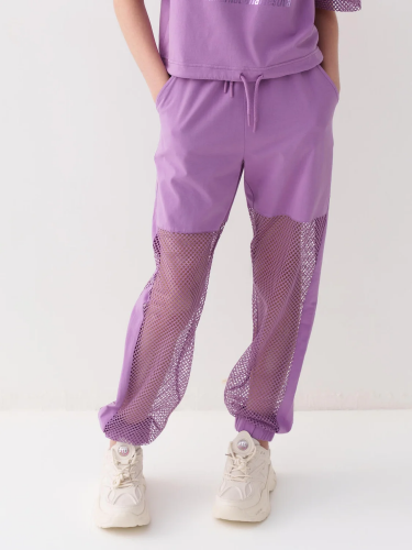 Детские спортивные брюки для девочки. Выполнены из хлопкового трикотажа футер без начеса. Модель свободного кроя со средней посадкой на талии. Пояс выполнен на резинке, дополнительно регулируется шнурком. По бокам — удобные карманы. В нижней части брючин предусмотрены эластичные трикотажные манжеты для лучшей посадки.