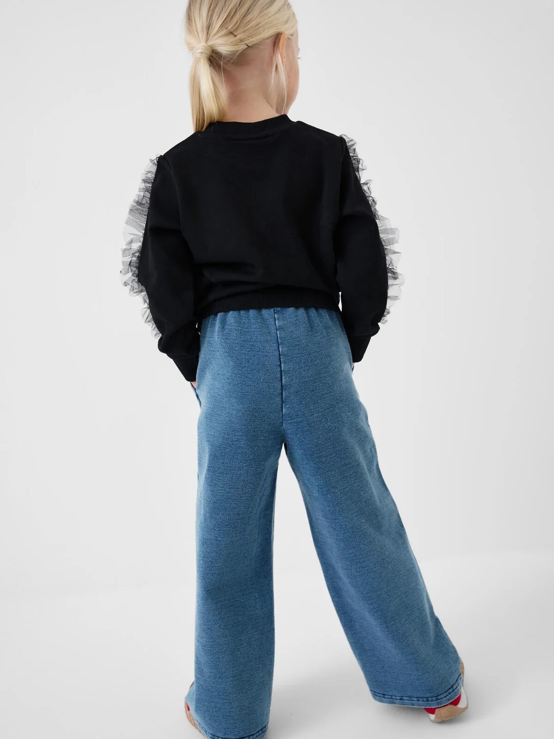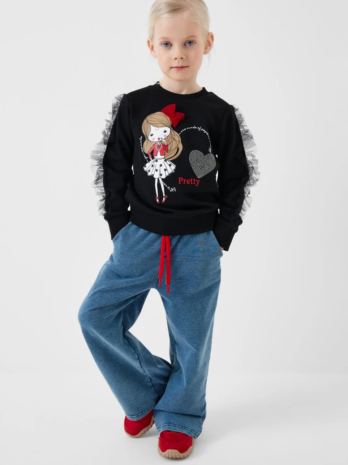 Детские брюки для девочки. Модель прямого кроя, выполнена из мягкого хлопкового трикотажа с эффектом денима. У брюк комфортный пояс на резинке и шнурок для регулировки. Спереди — два удобных кармана.