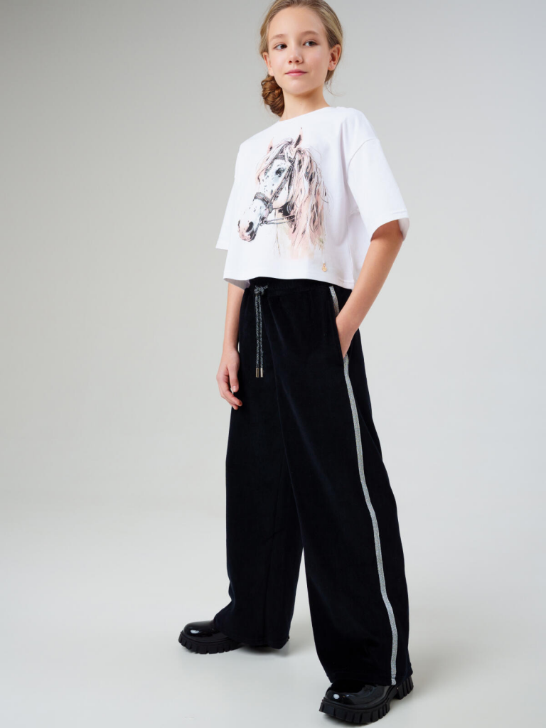 Брюки велюровые палаццо на резинке для девочки подростка от бренда PlayToday.Преимущества модели:+ брюки для девочки подростка — базовый элемент зимнего гардероба+ брюки на резинке со шнурком — регулируемая посадка, комфорт при движении+ два кармана по бокам — удобно для мелочей+ яркие лампасы+ размеры от 128 до 170 см — подойдут для девочек разного возраста+ тёплые трикотажные брюки — для школы, прогулок и отдыхаМодель выполнена из мягкого, плотного велюра — ткань приятная к телу, отлично сохраняет тепло и позволяет коже дышать. Удобный крой, резинка на талии со шнурками и боковые карманы делают эти брюки максимально практичными и комфортными.Когда и как носить:Идеальны для прохладной погоды. Носите в школу, на прогулку, в поездку или в качестве удобной одежды для дома. Отлично сочетаются с худи, лонгсливами и футболками. Лёгкие и тёплые — оптимальный выбор на каждый день.Советы по стилю:Комбинируйте с худи, утеплёнными свитшотами и кроссовками от PlayToday — получится стильный повседневный образ. Для домашнего уюта добавьте мягкий лонгслив. А для активного отдыха или прогулки — спортивную куртку или жилет. Универсальный крой вписывается в любой гардероб девочки-подростка. Подходит для девочек от 8 до 16 лет. 75% хлопок, 25% полиэстер