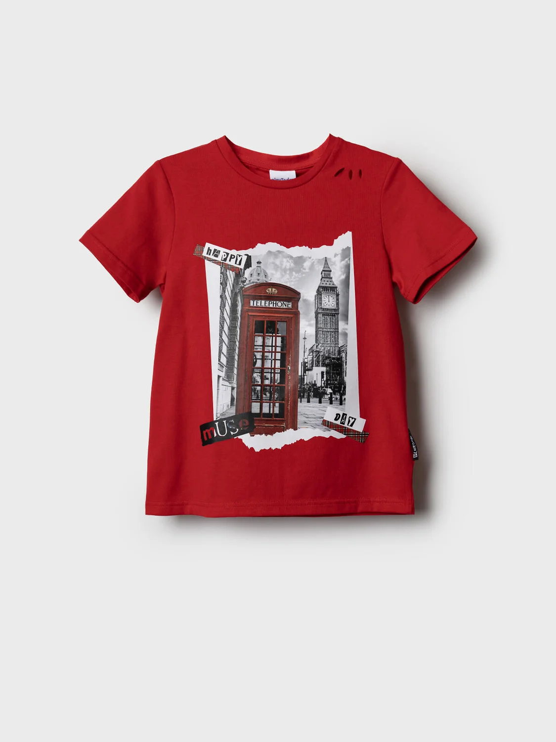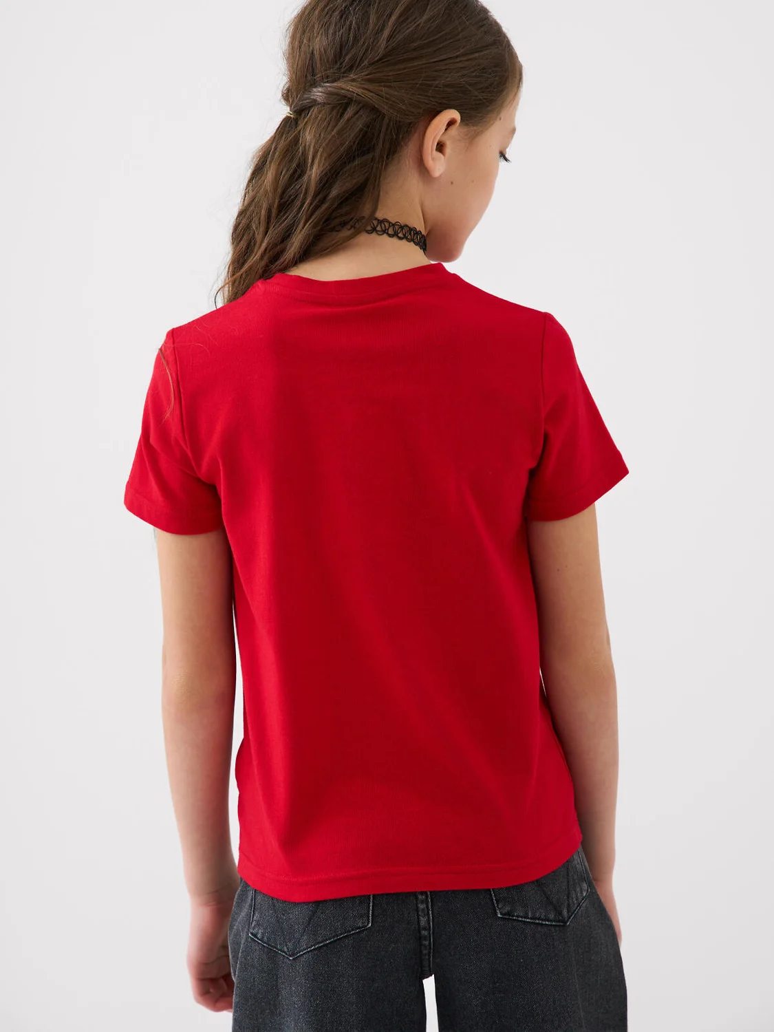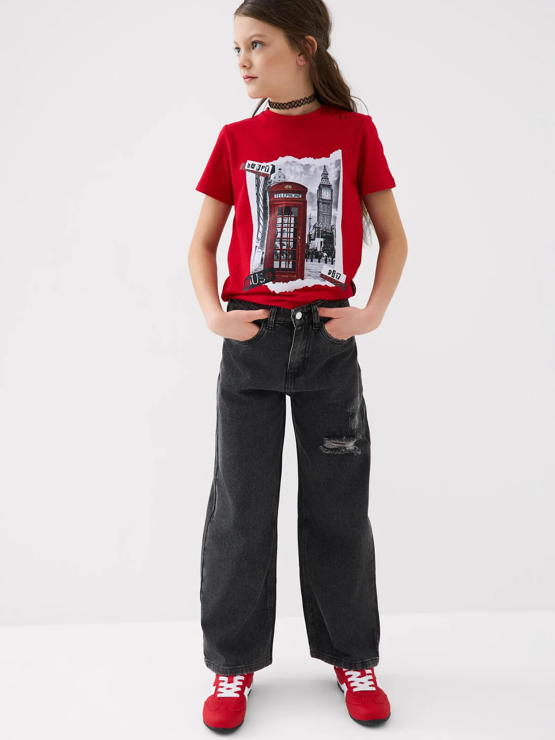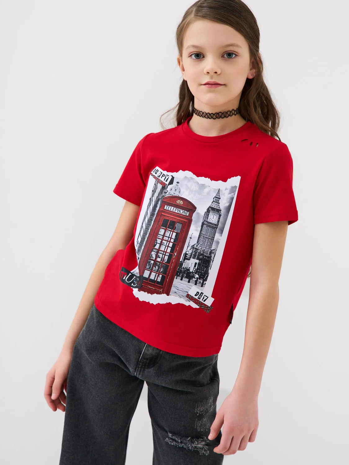 Футболка оверсайз для девочки подростка. Модель выполнена из эластичного хлопкового трикотажа джерси. На груди расположен крупный принт. Горловина круглая. Дополнительные элементы дизайна — декоративные разрывы на плече и боковая лента с логотипом бренда.