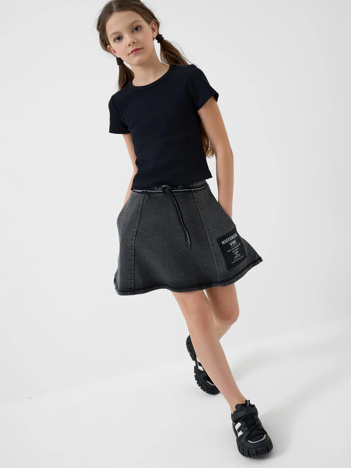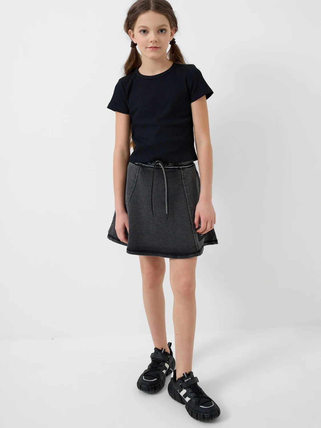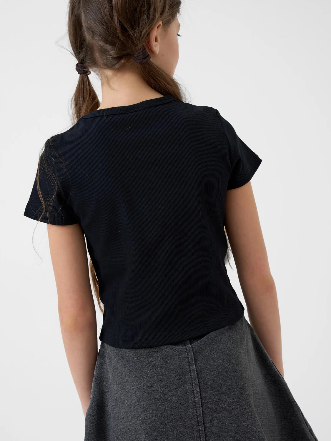 Футболка базовая для девочки подростка. Модель укороченная, выполнена из эластичного хлопкового трикотажа в рубчик. Горловина круглая.