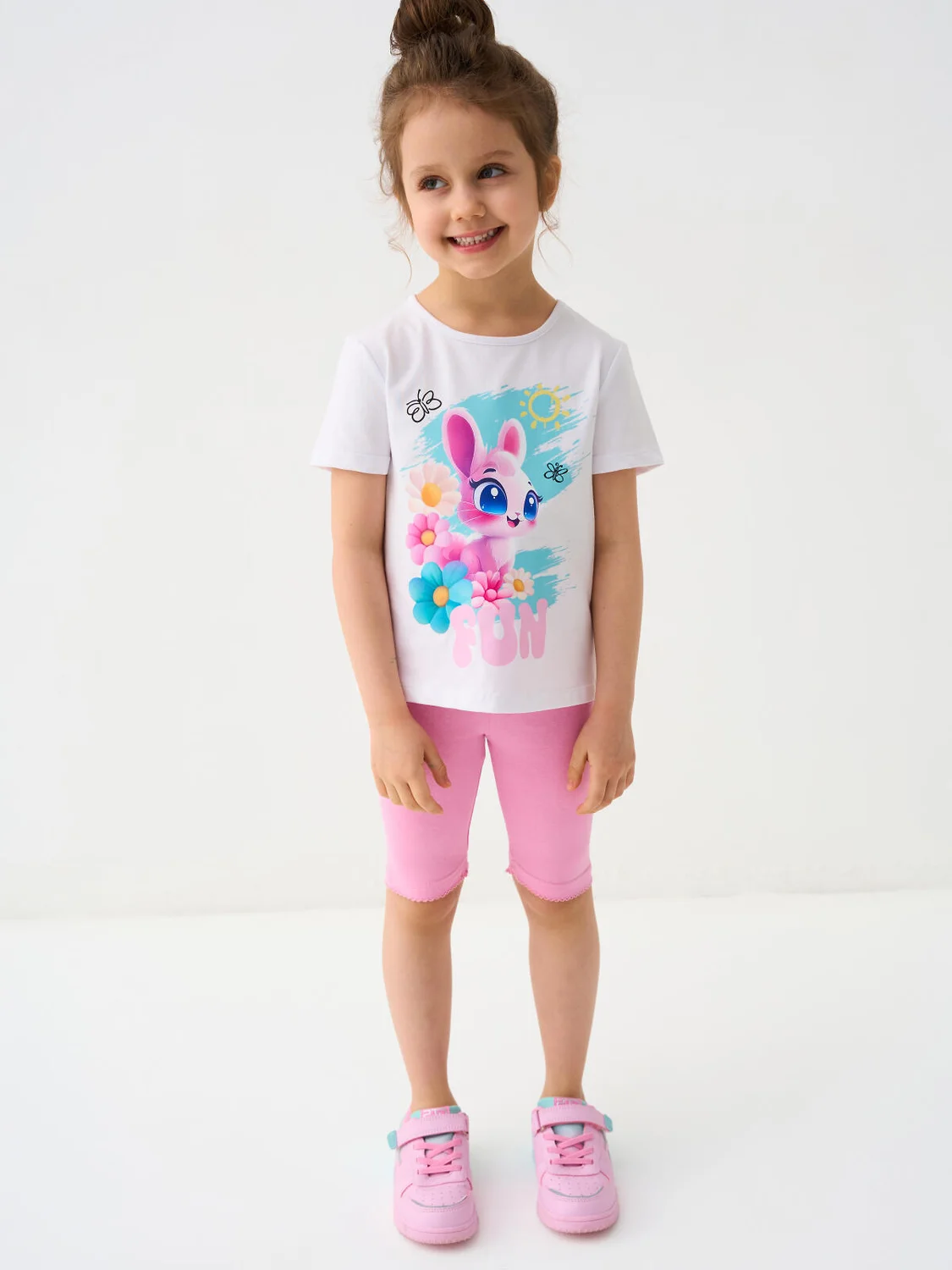 Детская футболка для девочки. Модель прямого кроя, выполнена из эластичного хлопкового трикотажа джерси. Спереди расположен крупный красочный принт. Горловина круглая.