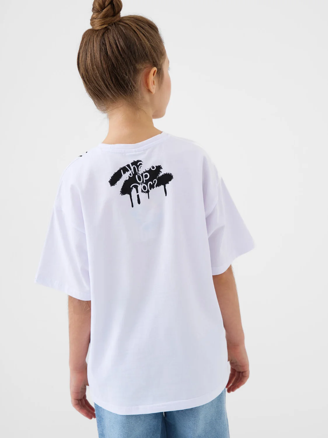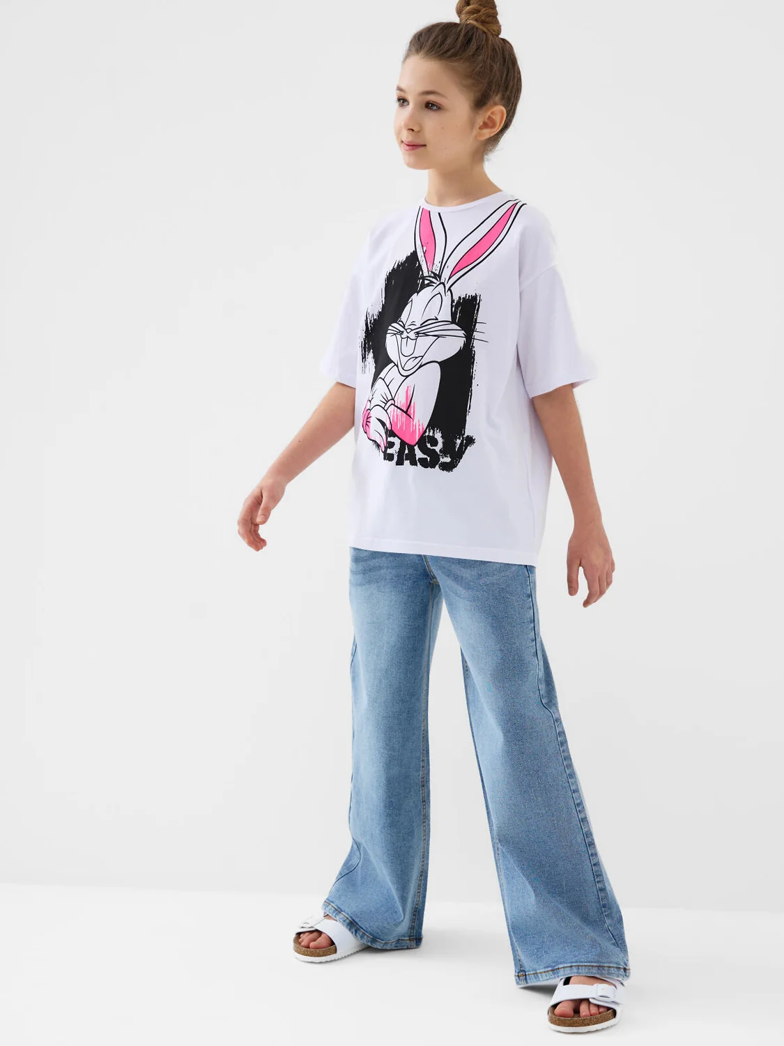 Футболка оверсайз для девочки подростка. Модель выполнена из эластичного хлопкового трикотажа джерси. На груди расположен крупный принт с любимым персонажем "Looney Tunes" Бакз Банни.