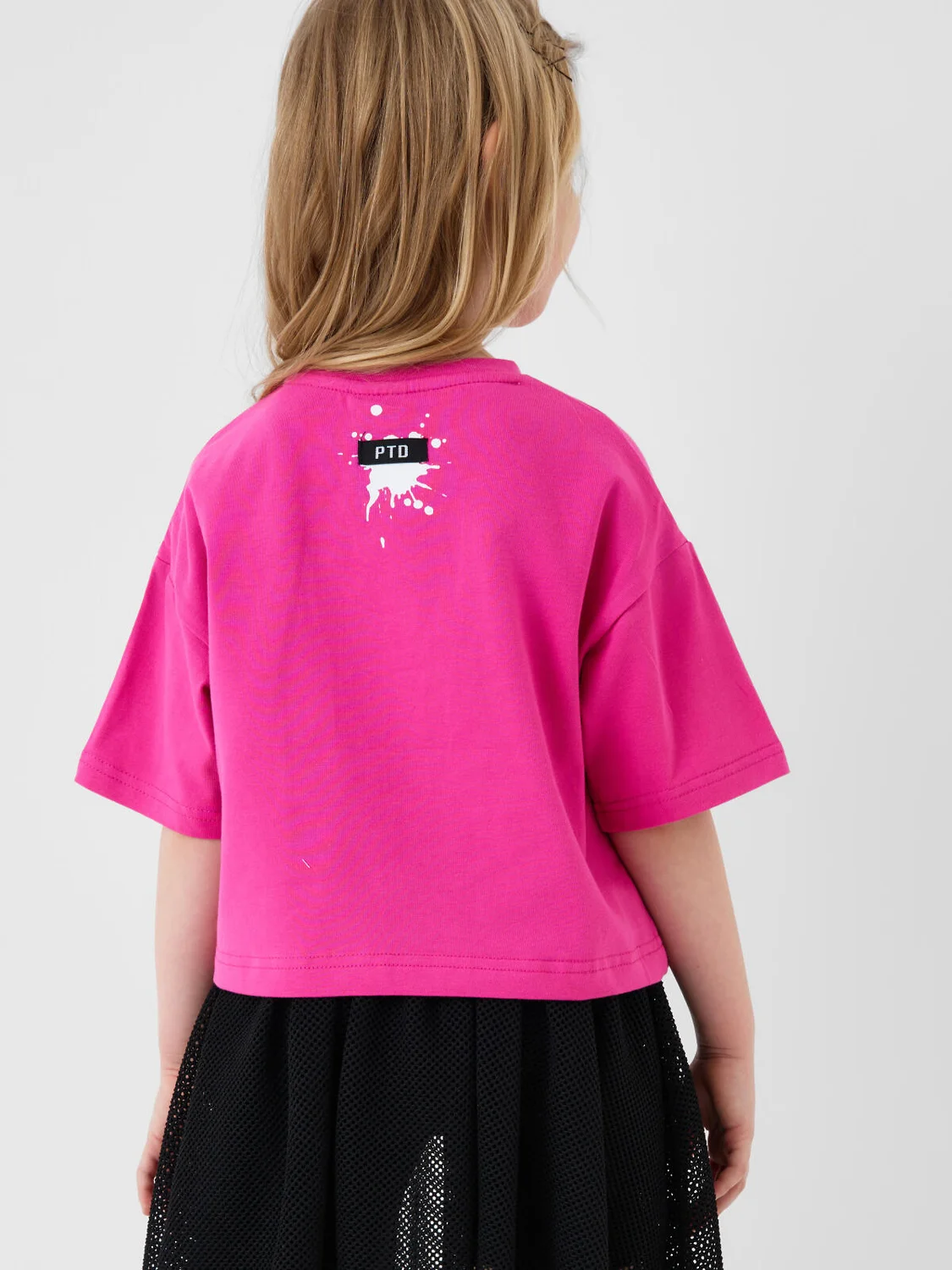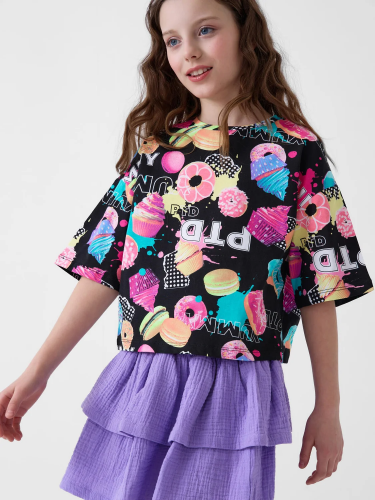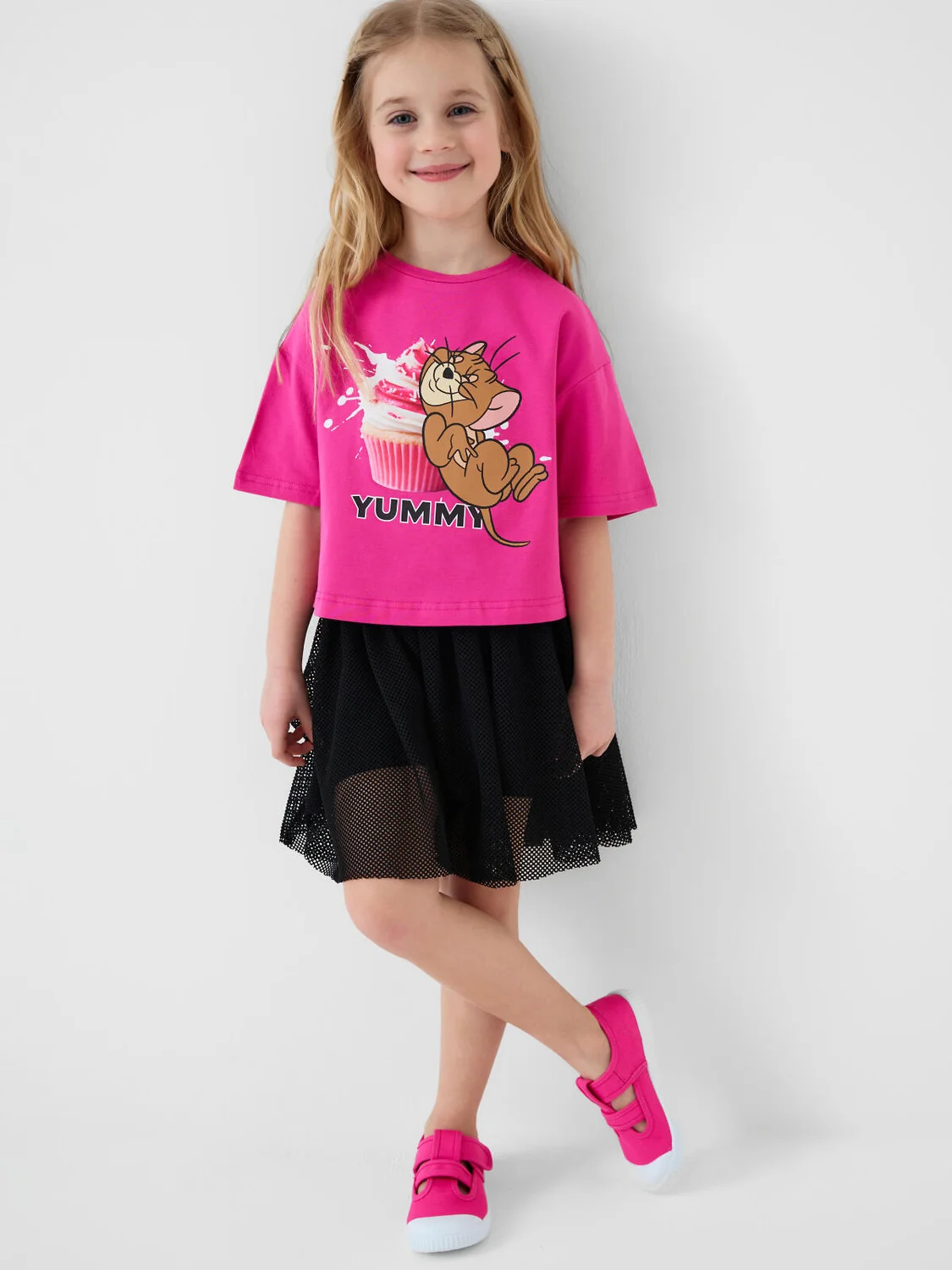 Детская футболка оверсайз для девочки. Модель выполнена из эластичного хлопкового трикотажа джерси. Спереди расположен крупный принт с любимым персонажем "Том и Джерри".
