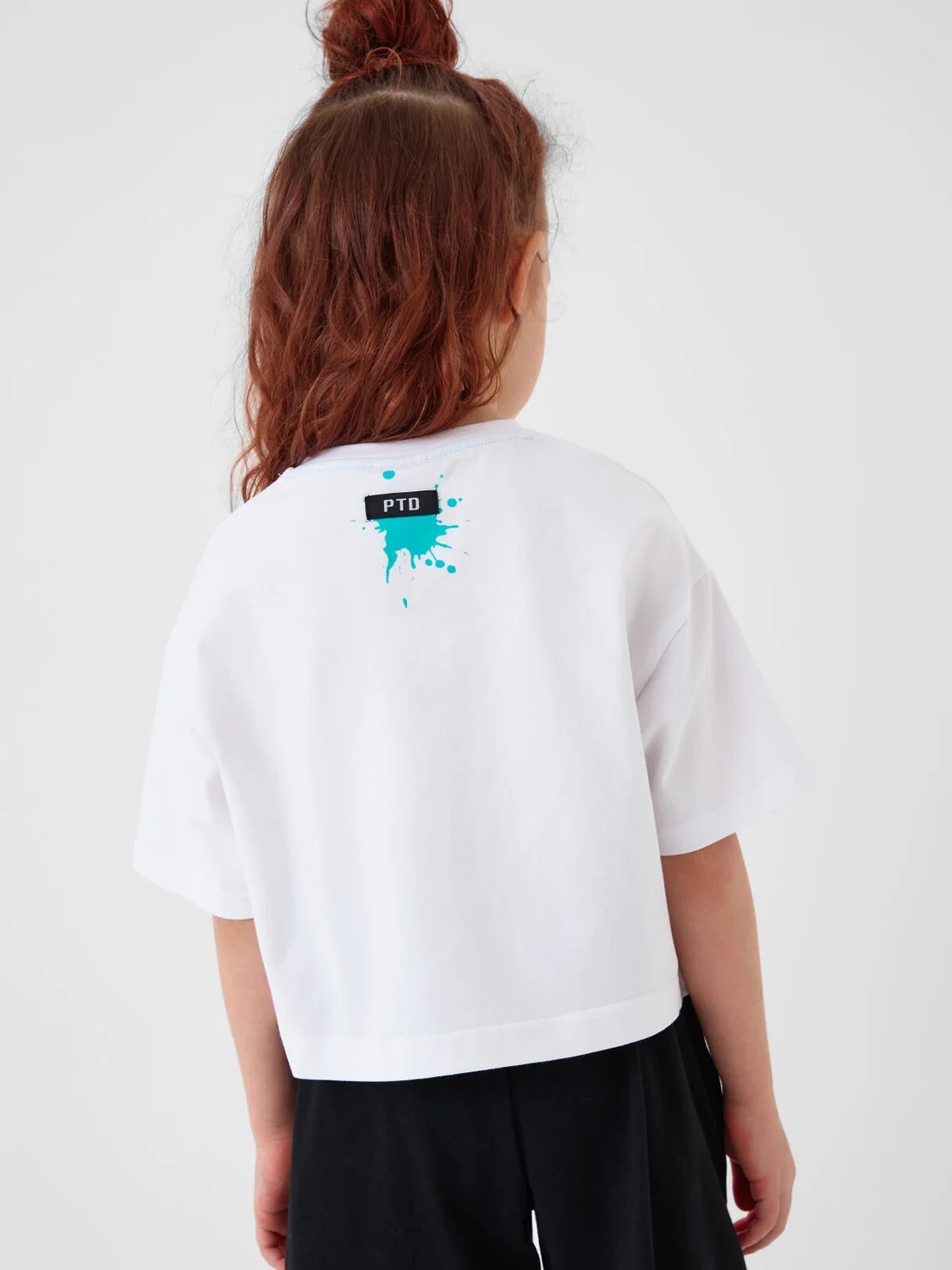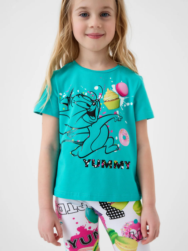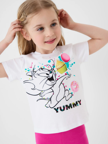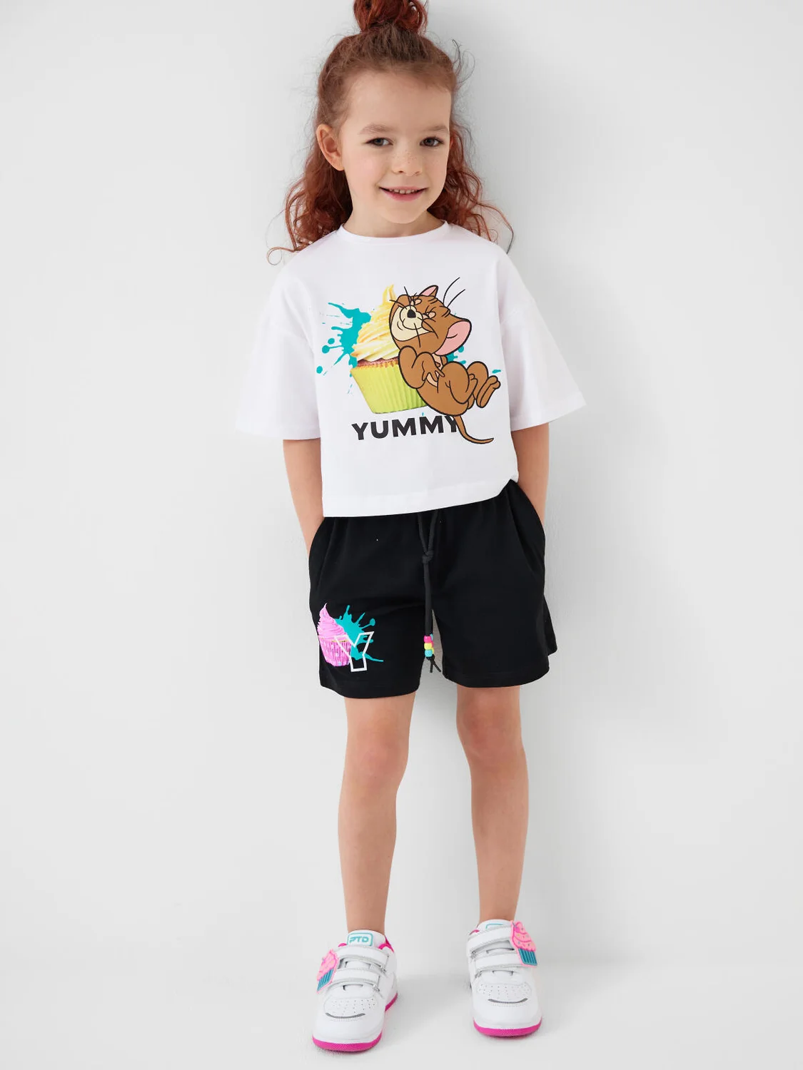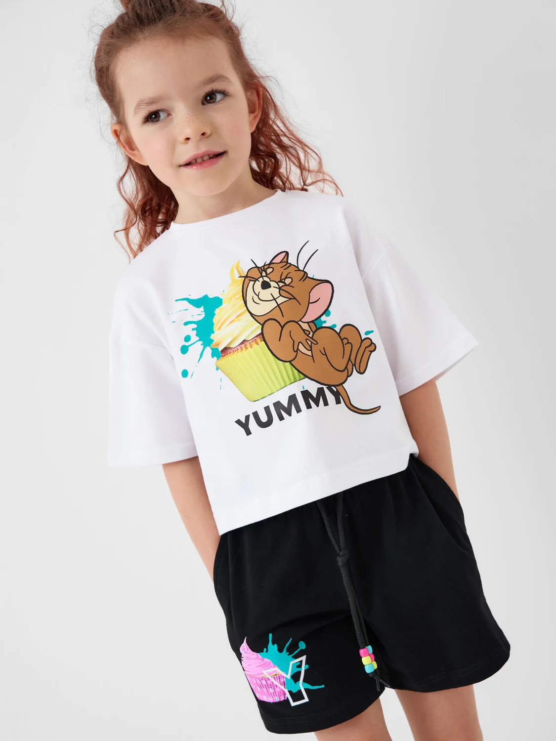 Детская футболка оверсайз для девочки. Модель выполнена из эластичного хлопкового трикотажа джерси. Спереди расположен крупный принт с любимым персонажем "Том и Джерри".