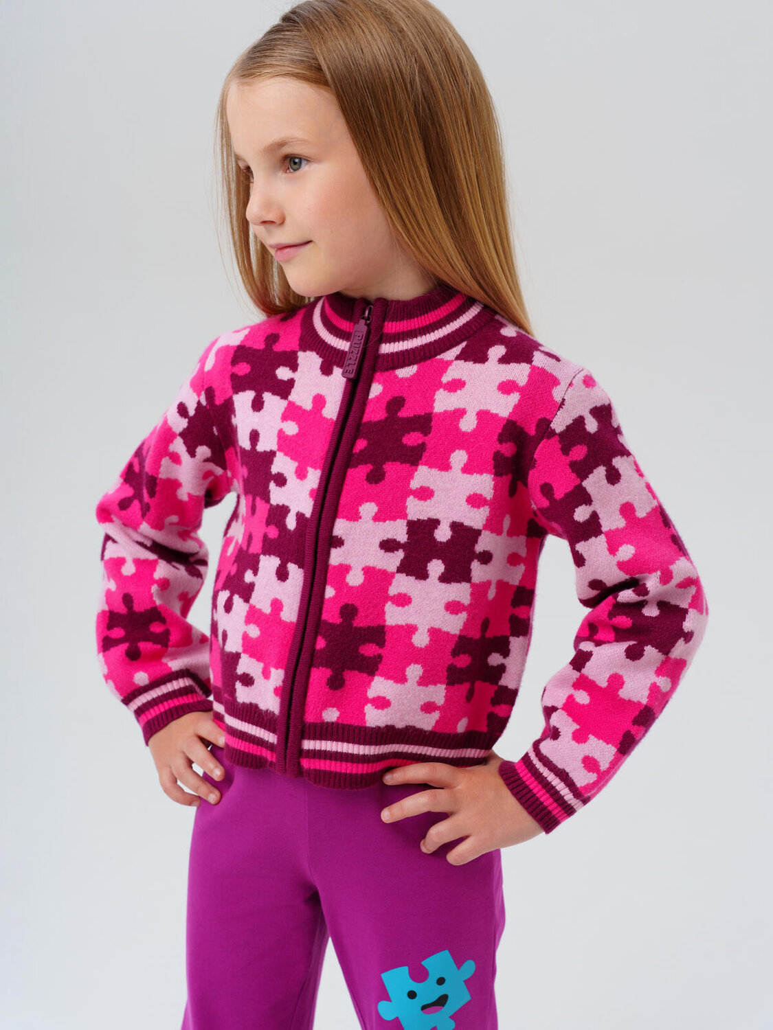 Вязаный розовый детский кардиган для девочки от PlayToday — тёплая и уютная вещь на каждый день, созданная специально для маленьких модниц. Яркий принт в виде пазлов привлекает внимание и создаёт настроение, а мягкий состав делает кардиган особенно приятным к телу. Идеально подойдёт для детского сада, прогулок и домашних игр.