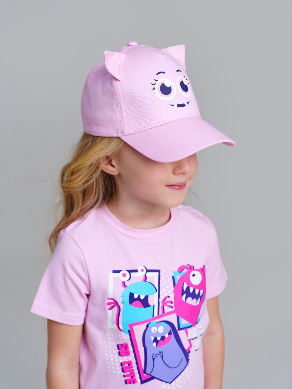 Кепка детская для девочки. Кепка из 100% хлопка. Изогнутый прозрачный козырек защищает глаза от солнца и сохраняет лицо в тени. Регулировка ширины резинкой. Декор - ушки.