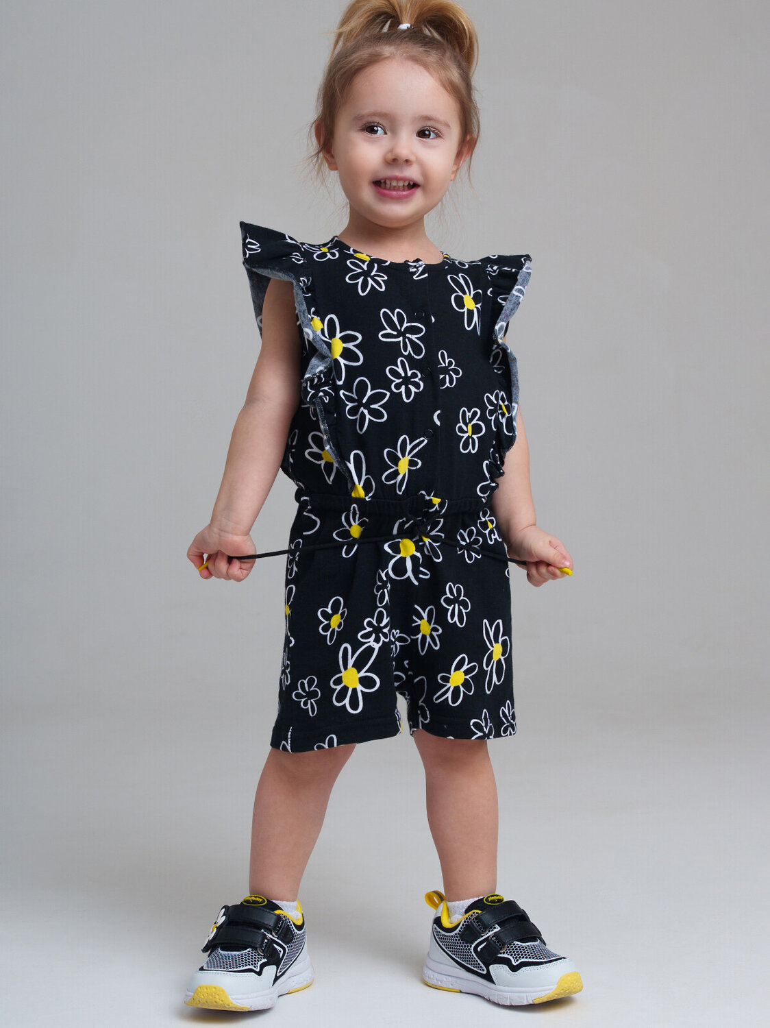 Комбинезон детский для девочки из качественного и приятного на ощупь трикотажа джерси. Застежка на кнопки. Пояс на резинке со шнурком. Высокое содержание хлопка. Благодаря наличию эластана в составе ткани изделие держит форму и меньше мнется. Модель выполнена из качественного и приятного на ощупь трикотажа.
