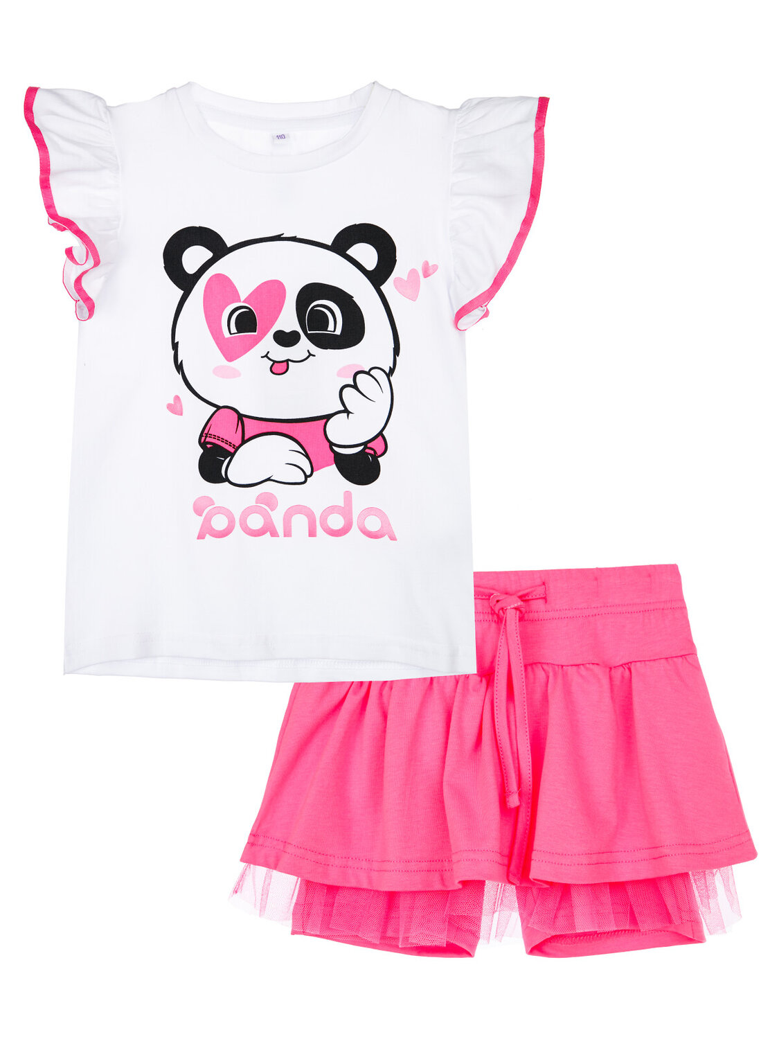 Комплект: футболка и юбка-шорты из качественного эластичного и приятного на ощупь трикотажа. Оптимальная посадка: не сползают при движении. Эластичный пояс. Высокое содержание хлопка. Благодаря наличию эластана в составе ткани изделие проще в уходе и держит форму.