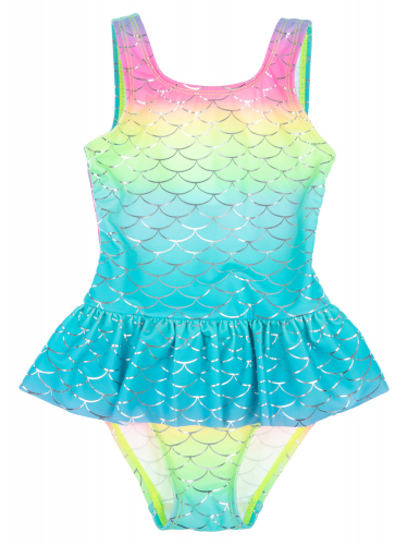Быстро сохнет и сохраняет первоначальный вид и форму даже при длительном использовании. Устойчивая к выгоранию ткань. Серебряное тиснение в виде чешуи. Подходит для плавания в бассейне.