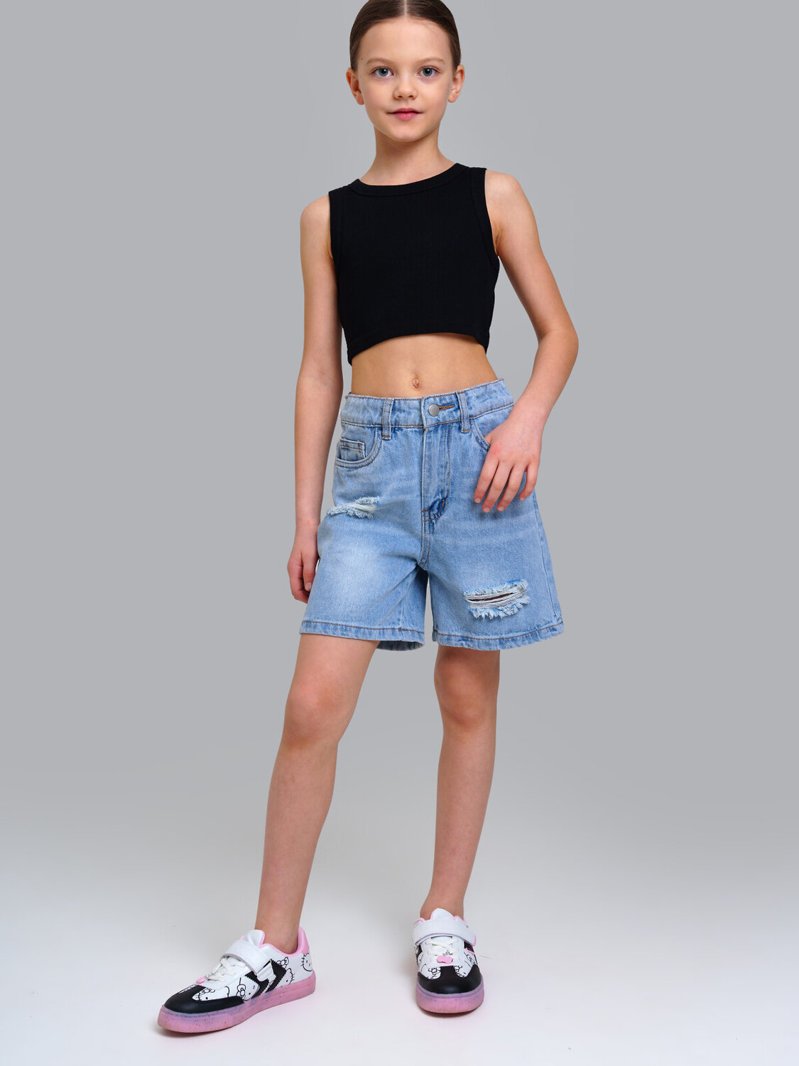 Джинсовые шорты для девочки подростка. Шорты свободного силуэта. Пояс с внутренней утяжкой. Застежка на молнию и болт. Функциональные карманы. Трендовые элементы потертости и дыры.